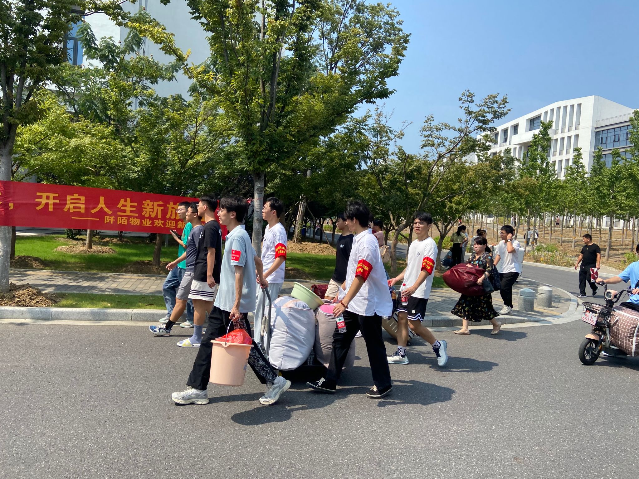 各院系级党组织积极响应,精心安排,动员师生党员投入到迎新志愿服务活动。2023级新生报到当天,炎热的天气丝毫没有消减党员志愿者们的服务热情。校园里,随处可见“志愿服务队”“迎新服务站”“党员先锋岗”,党员志愿者们通过佩戴党员徽章、袖章、绶带等标识,亮明党员身份,以热情饱满的精神状态迎接来自全国各地的新生。“同学,先喝口水,我带你去报到”“同学,那个重,我来帮你搬……”他们主动到家长和新生面前,热情地接过沉甸甸的行李箱,为学弟学妹提供咨询答疑、引路指导、秩序维护、行李转运,直至入住寝室,给新生温暖周到的服务。