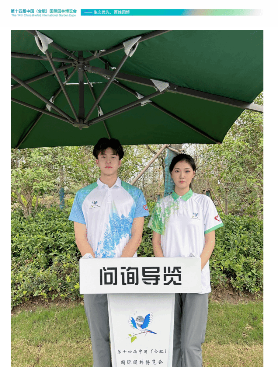 本网讯 9月26日,第十四届中国(合肥)国际园林博览会盛大开幕,合肥市民与全国各地游客共赴美丽生活绿色之约。此次园博会志愿者服装是由安徽省老字号合肥清华胜嘉服饰有限公司鹰爪品牌与我校美术与设计学院张冰洁师生团队联合设计研发生产。