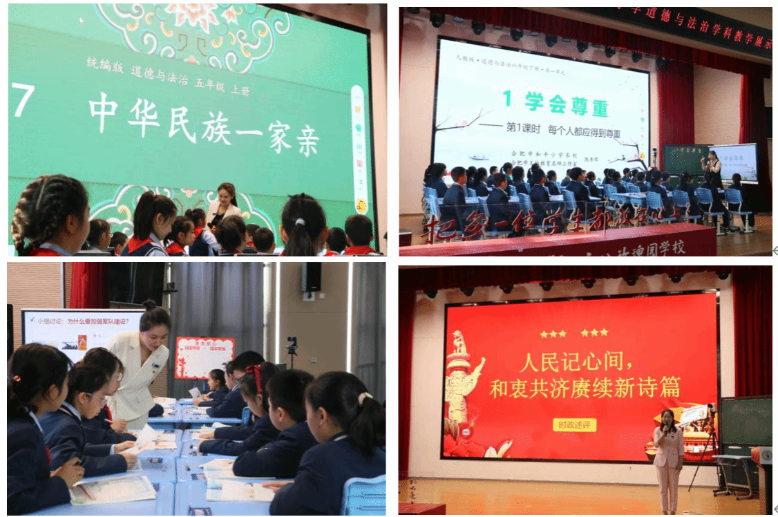 合肥一六八玫瑰园学校夏飞雪老师、合肥市和平小学东校陈秀琴老师、合肥市奥体小学何子皿老师、肥东县宝翠园小学苏海艳老师分别执教道德与法治课五年级上册第七课《中华民族一家亲》、六年级上册第一课《学会尊重》《习近平新时代中国特色社会主义思想学生读本》(小学高年级)第12讲《强国必须强军》、时政述评《人民记心间,和衷共济赓续新诗篇》,四位老师精神饱满,知识讲解中重视启发学生问题探究的多维思考,学理阐释中重视对学生进行正确政治方向和价值观念的引领,较好地体现了思政课是落实立德树人根本任务的关键课程,以“皖美”诠释了思政课的课堂模样和改革创新取向。