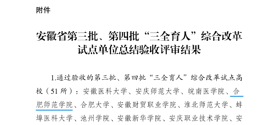 自获批“三全育人”综合改革试点高校以来,学校党委高度重视,成立由学校党政主要负责人为双组长的“三全育人”综合改革试点工作领导小组,对标建设标准,制定工作方案和相关配套实施细则,全面统筹办学治校各领域育人资源和力量,形成了党委统一领导、部门分工负责、院系组织落实、全员协同参与的责任体系。课程育人全面推进。完成“三个一百”课程思政专项建设计划,学校获批安徽省课程思政先行高校、省级教学团队和教学名师各2人,不断深化思政课改革创新,成立全省首个“合肥地区大中小学思政课一体化建设备课联盟”。科研育人着力加强。依托省、校平台,搭建“电子信息系统仿真设计省重点实验室”“青少年心理健康与危机智能干预省社科重点实验室”等省级科研平台14个。实践育人成果丰硕。建设省级创新创业学院,学院连续四年荣获全省职业规划大赛一等奖。开办特色实践活动“行知学堂”,服务留守儿童,获评中国青年志愿服务项目大赛金奖等国家级荣誉。文化育人特色鲜明。连续举办28届大学生科技文化艺术节,连续举办16届“感动合师”十大青年学生评选活动,在时间积淀中不断擦亮校园文化品牌。网络育人亮点纷呈。升级校园网主页,策划《三全育人进行时:师者说?同学谈》《致敬吾师》等专栏,加强全媒体中心建设,培育网络名师,精心搭建网络育人平台。心理育人大力促进。建立四级心理危机干预体系,开展“一院一品”等心理健康品牌项目创建,《心理学》课程入选国家级一流课程,23年5月省心理健康平台正式运行。管理育人扎实推动。强化顶层设计、运行机制和队伍建设,在领导带头中大力倡导育人之风,在规章制度中精准体现育人优先,在管理服务中积极落实育人使命。服务育人不断深化。“一分钱早餐”活动被国家级媒体多次报道,“一站式”学生社区打通育人“最后一公里”,“智慧校园”综合系统持续完善,信息化服务师生效能显著提升。资助育人精准推进。创新资助育人形式,开通“绿色通道”,开展诚信感恩主题教育、“出彩合师”等励志典型宣传,落细落实工作体系。组织育人不断优化。学校获批全国高校样板党支部,首批全省高校“双带头人”教师党支部书记工作室。