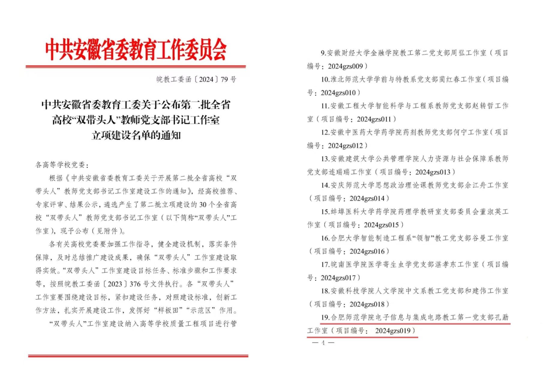 近日,中共安徽省委教育工委发布《关于公布第二批全省高校“双带头人”教师党支部书记工作室立项建设名单的通知》,遴选建设全省高校30个“双带头人”教师党支部书记工作室,我校电子信息与集成电路学院教工第一党支部孔勐工作室获批立项建设。