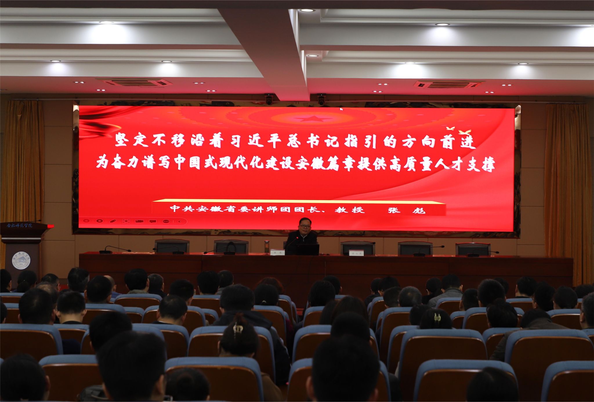 首场讲座邀请了省委讲师团团长张彪教授作报告。张彪以“坚定不移沿着习近平总书记指引的方向前进,为努力谱写中国式现代化建设安徽篇章提供高质量人才支撑”为题,从坚定不移沿着习近平总书记指引的方向前进、奋力谱写中国式现代化建设安徽篇章、切实为现代化建设提供高质量的人才支撑三个方面,对习近平总书记视察安徽的重要讲话和指示批示精神进行了系统阐述,深刻分析了现代化美好安徽建设的总体要求、发展目标和重点任务。对学院融入安徽“三地一区”战略定位、建设“七个强省”奋斗目标,张彪提出要以高质量党建为引领,坚持立德树人的根本任务,不断优化调整学科布局,建设高素质教师队伍和管理干部队伍,以实际行动为谱写中国式现代化建设安徽篇章作出合师人更大的贡献。