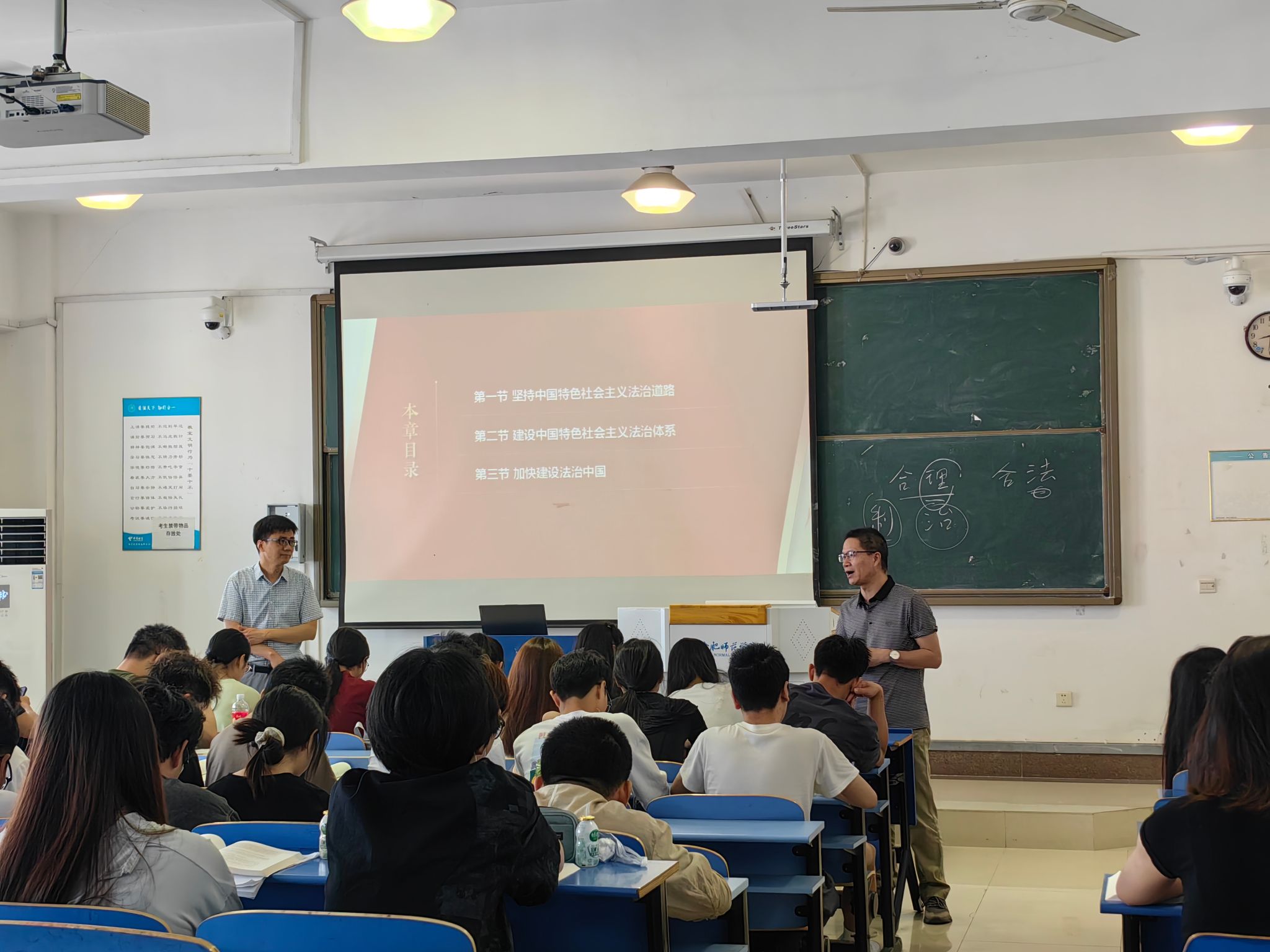 5月24日上午,在锦绣校区逸夫楼A404教室《习近平新时代中国特色社会主义思想概论》课堂上,马克思主义学院开展了“多师同上”一堂思政课教学活动。张军占、谷向阳、何光辉三位教师先后同台,为学生深度解析“全面依法治国”专题内容。