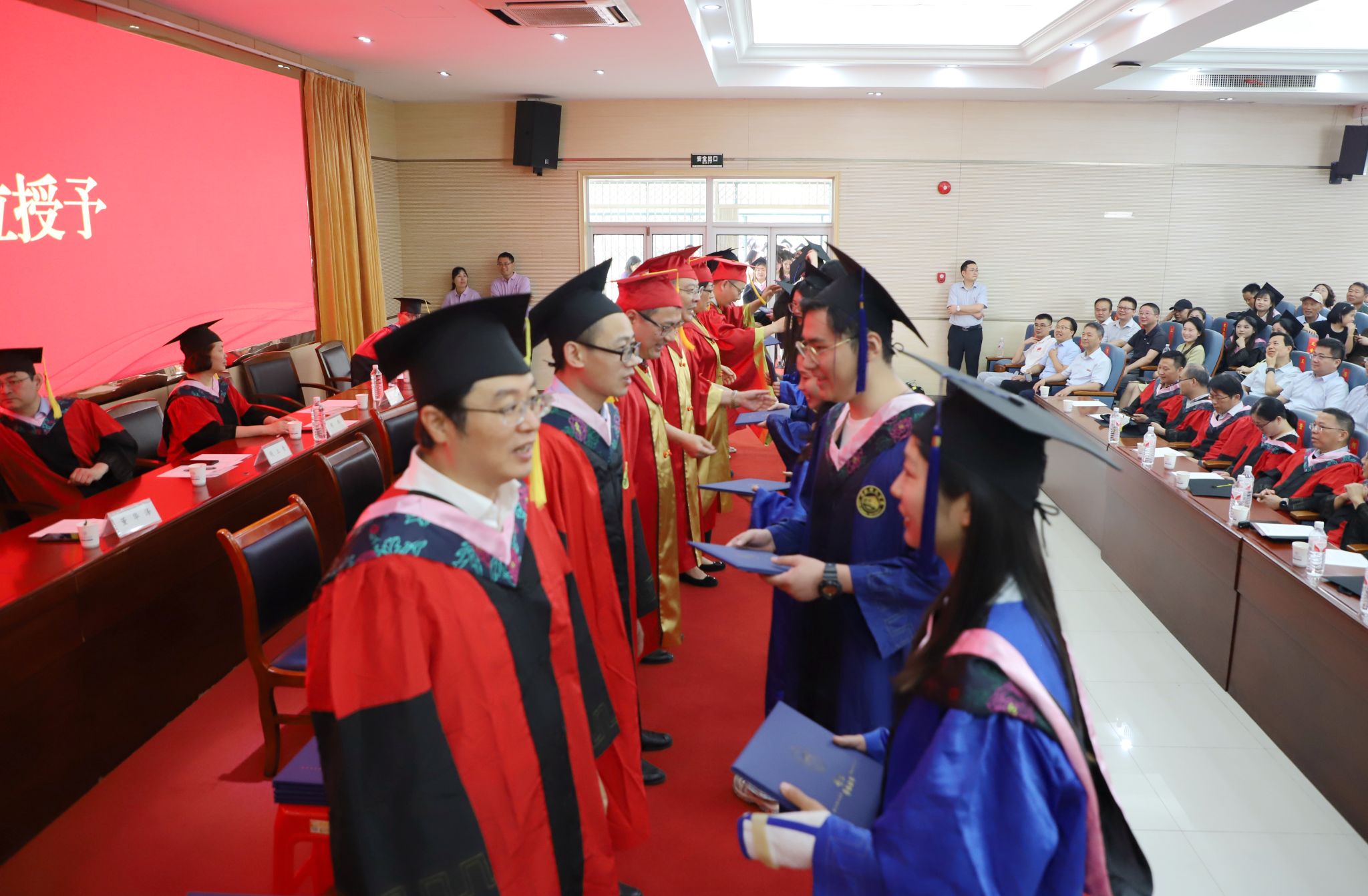 院领导、学位评定委员会委员为毕业生们逐一拨穗正冠、颁授学位证书,并送上美好祝福。毕业生向老师们深深鞠躬,表达感谢。