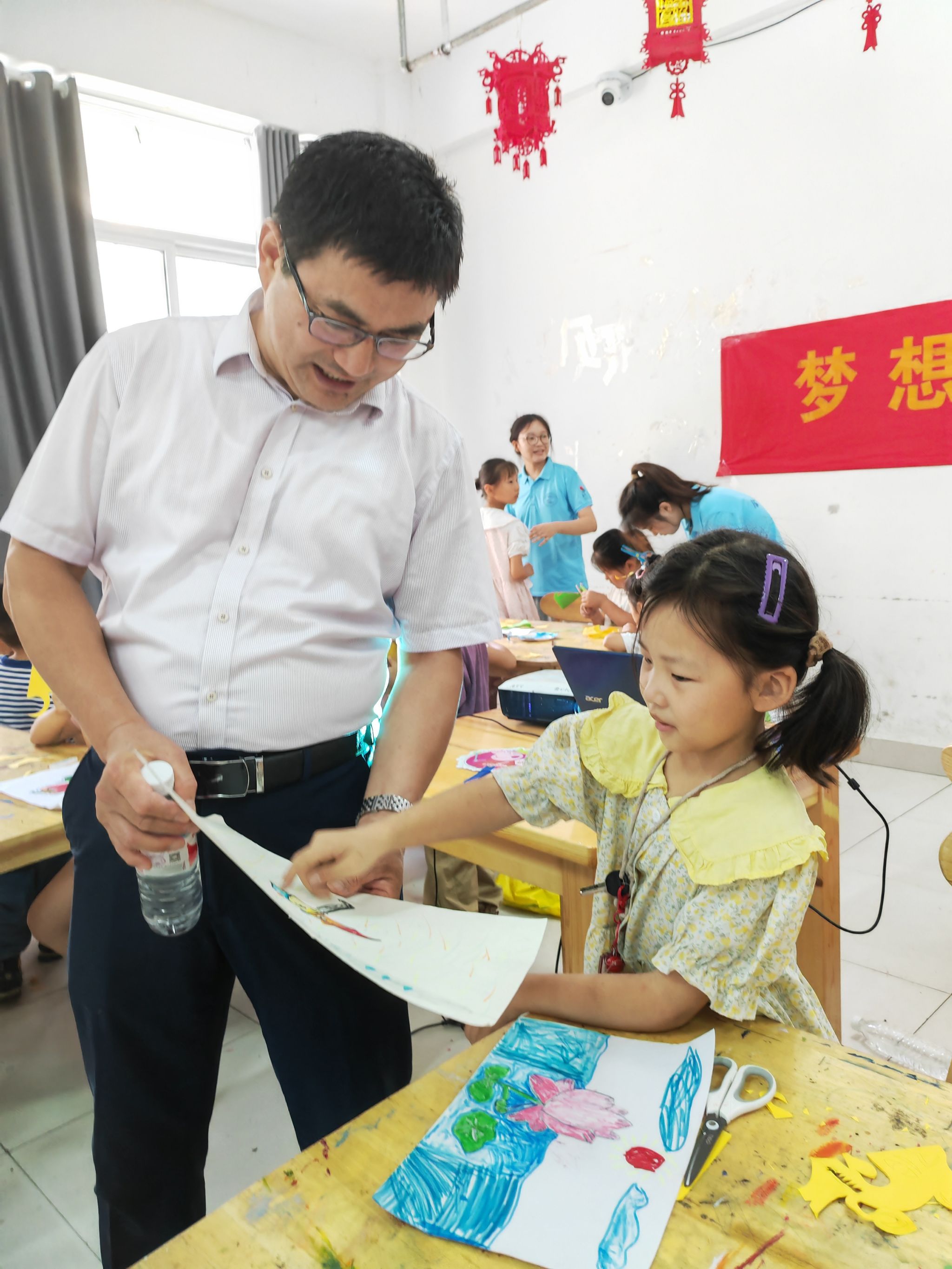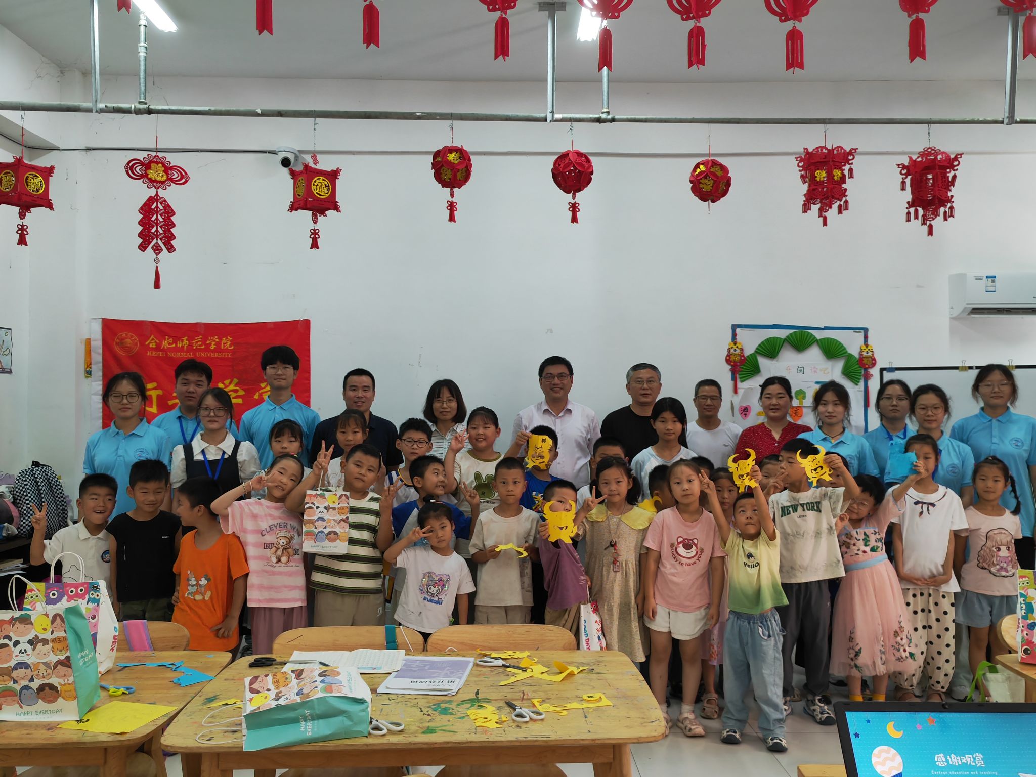 随后,周端明一行为小学员们赠送了精美的学习文具礼品,小学员们在接到礼品后,也激动地把自己在学堂上的剪纸和绘画作品赠送给各位老师和小先生,表达他们对老师的喜爱和感激之情。