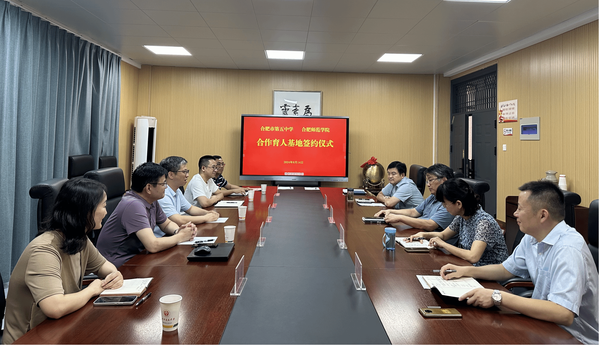 为进一步加强与基础教育交流合作,提升人才培养质量和服务社会能力,8月14日下午,388vip太阳集团和合肥市第五中学合作交流活动在合肥五中和平校区举行。合肥五中党委书记熊荣领,党委副书记、校长王岚,党委委员、副校长何劲松、葛暄和我院党委委员、副院长华银峰,教务处处长钱立青、美术与设计学院副院长李辉周等一行5人参加了本次活动。