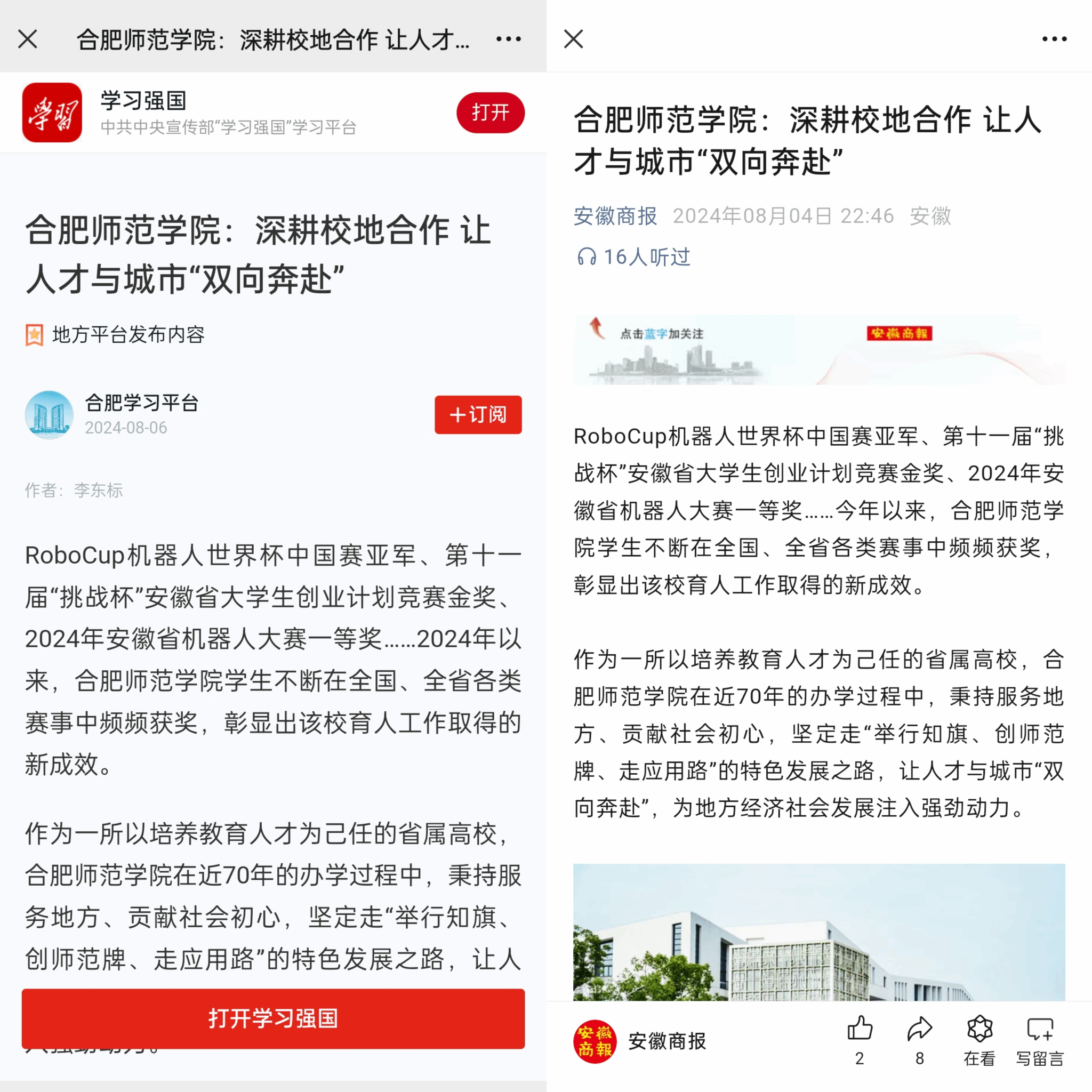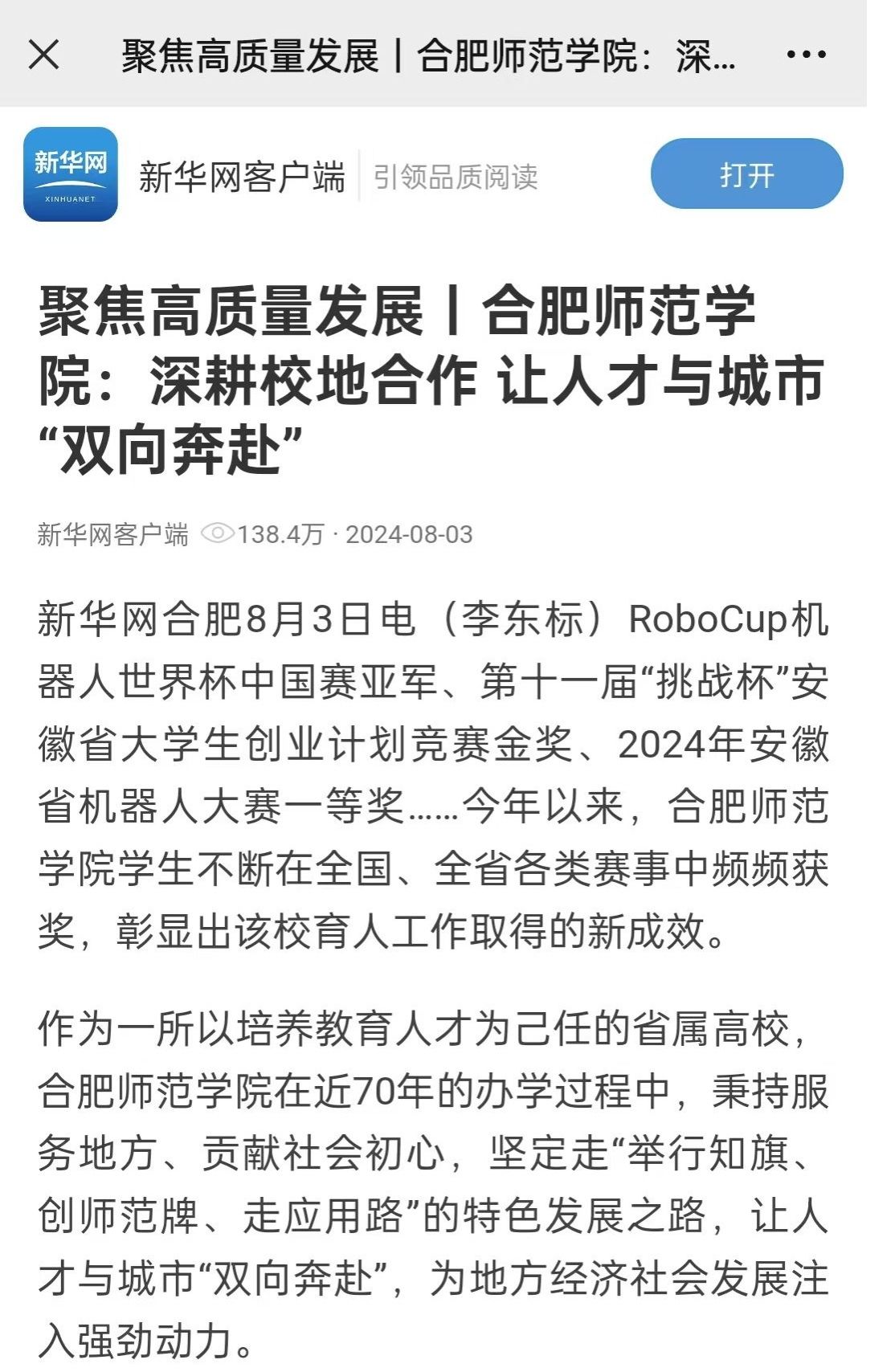 近日,新华网首页、新华网客户端以《聚焦高质量发展丨388vip太阳集团:深耕校地合作 让人才与城市“双向奔赴”》为题专题报道了我校深耕校地合作,深化基础教育合作,服务地方产业发展的重要举措及成效,总浏览量200万余次。学习强国、安徽商报等进行了转载。(宣传部)