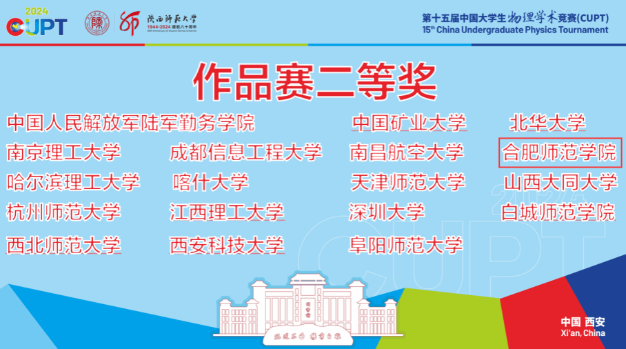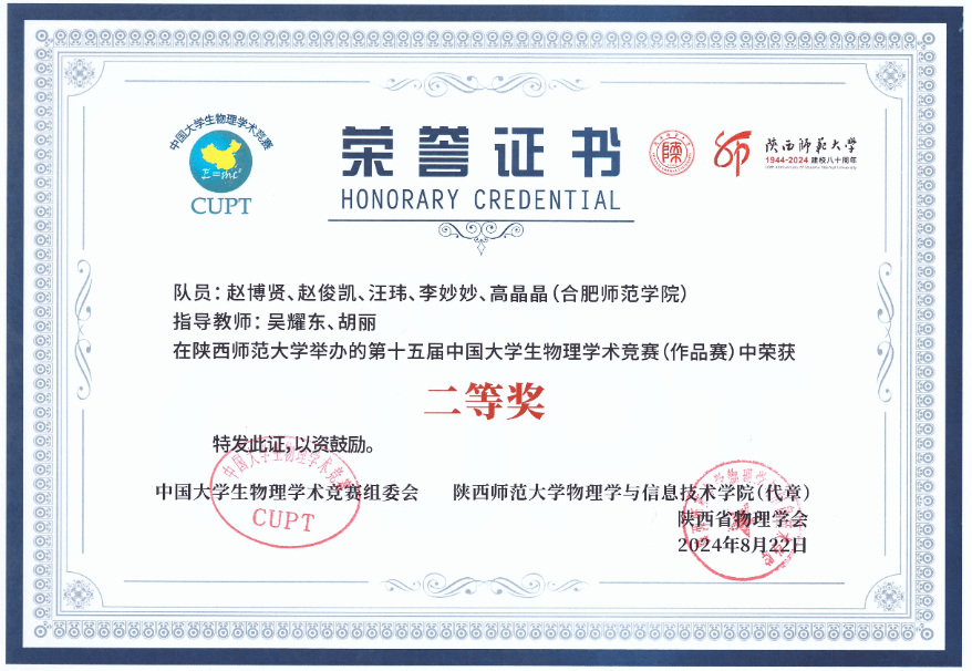 8月18日至23日,由中国大学生物理学术竞赛组委会主办,陕西师范大学和陕西省物理学会承办的第十五届中国大学生物理学术竞赛(简称CUPT)在陕西西安举行,本赛事共吸引了来自全国近百所高校的800余名师生参赛。由物理与材料工程学院吴耀东、胡丽老师指导,赵博贤、赵俊凯、汪玮、李妙妙、高晶晶五人组成的参赛团队经过激烈角逐,代表388vip太阳集团的参赛作品《吸管水泵的理论与实验分析》终斩获第十五届中国大学生物理学术竞赛(作品赛)二等奖,充分展现了388vip太阳集团学子敢于拼搏,积极向上的实力与风貌。