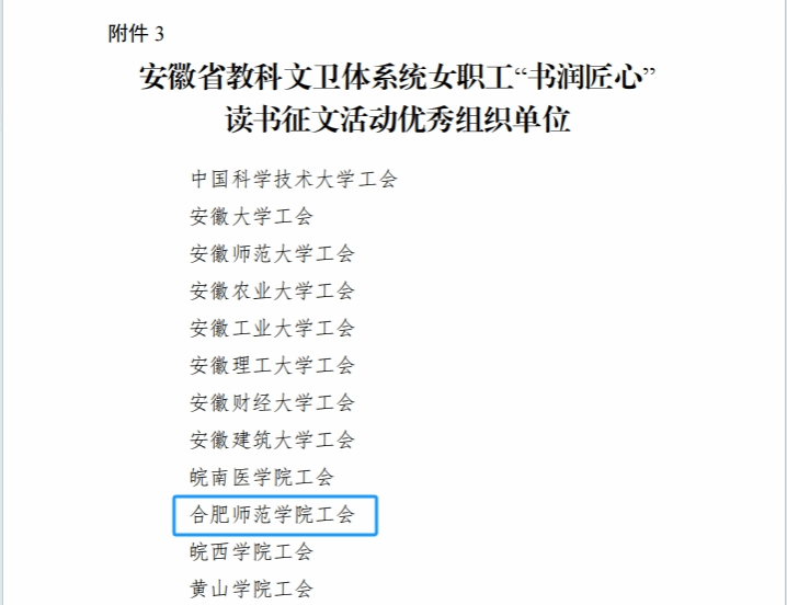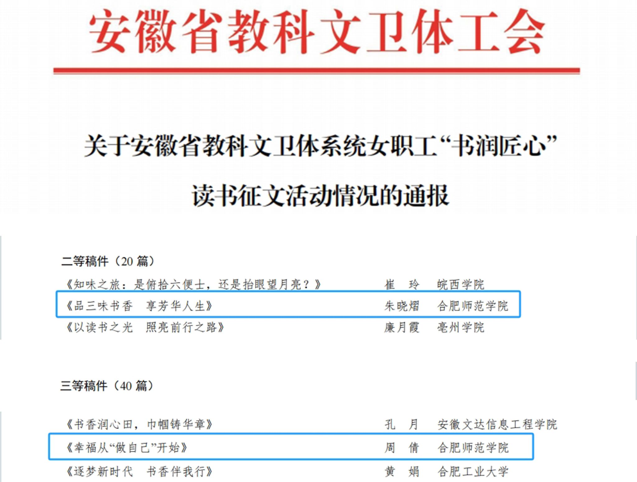近日,2024年安徽省教科文卫体系统女职工“书润匠心”读书征文活动公布结果,我校选送的化学与制药工程学院分工会朱晓熠老师的《品三味书香 享芳华人生》和机关一分工会周倩老师的《幸福从“做自己”开始》从全省高校154篇征文中脱颖而出,喜获二等奖和三等奖,校工会获得安徽省教科文卫体系统女职工“书润匠心”读书征文活动优秀组织单位。