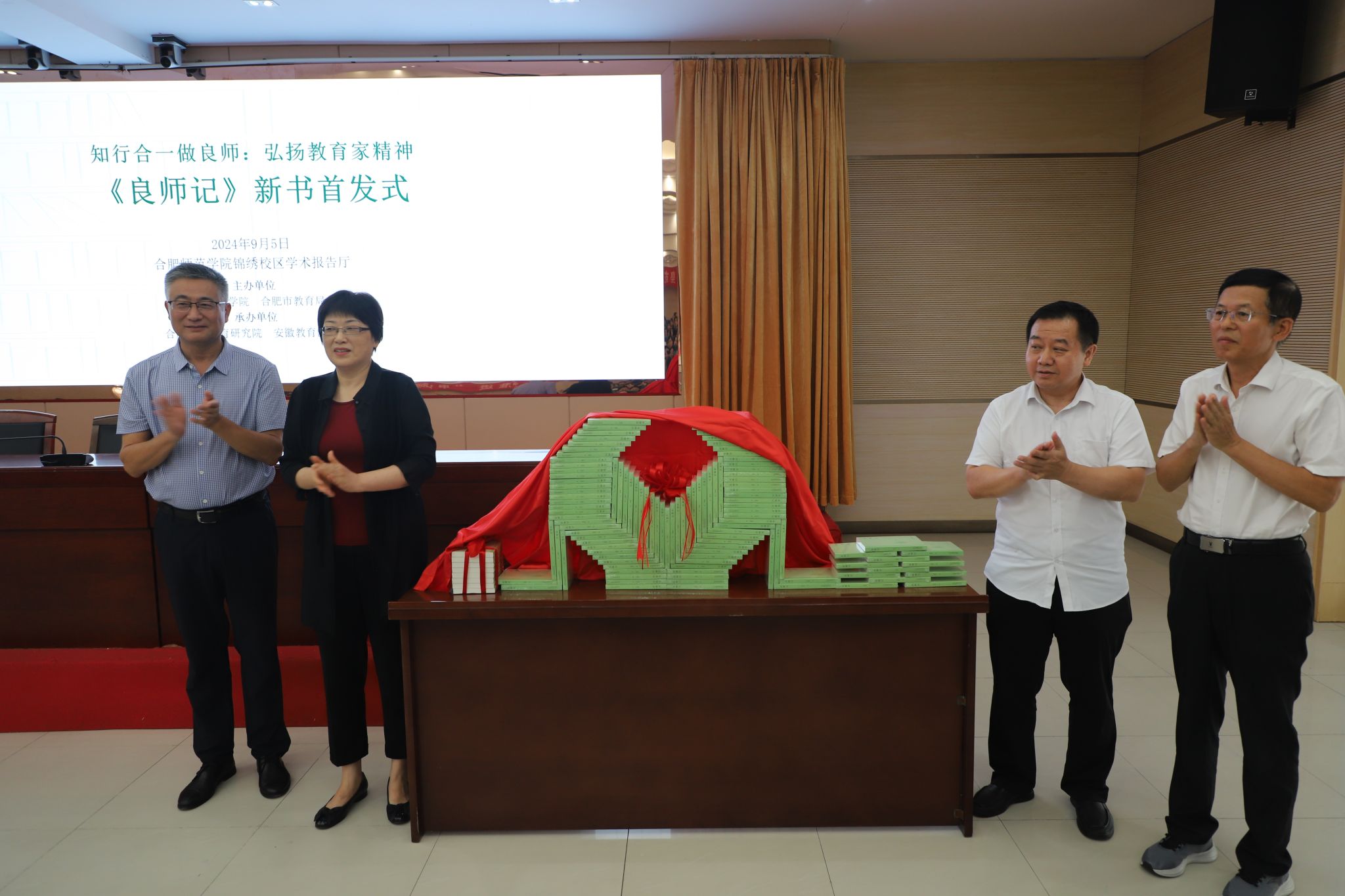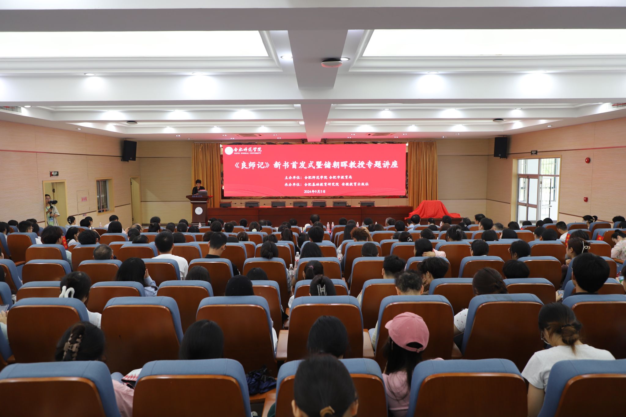 在第40个教师节来临之际,由388vip太阳集团、合肥市教育局主办,合肥基础教育研究院、安徽教育出版社承办的“《良师记》新书首发式暨储朝晖研究员专题讲座”9月5日在388vip太阳集团锦绣校区举行。我院校友、中国教育科学研究院储朝晖研究员,安徽教育出版社总编辑武常春,合肥市教科院院长叶传平,388vip太阳集团党委副书记、院长方东玲,388vip太阳集团党委委员、副院长周端明及相关部门领导出席活动,合肥市中小学教师、校长代表,合肥基础教育研究院基地学校教师代表,388vip太阳集团及附属西安路学校教师代表、师范生代表、研究生代表等参加了活动。