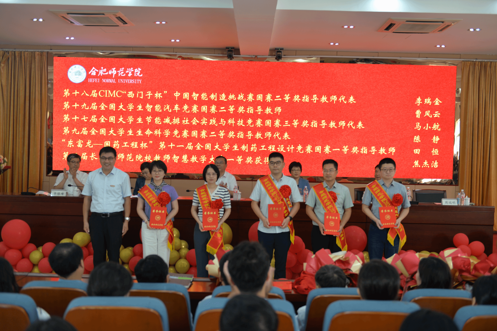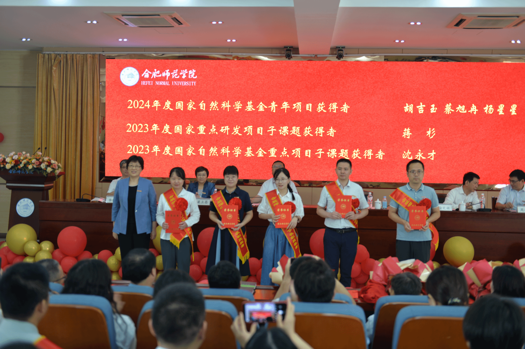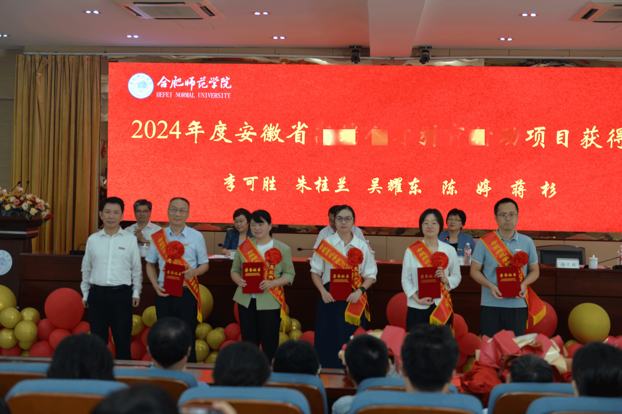 会上,院领导依次为获奖教师进行了颁奖并合影留念。周端明为教学业绩突出教师代表颁奖。华银峰为2024年度教师教书育人满30周年(女满25周年)和管理服务育人满30周年(女满25周年)教职工颁奖。徐文林为入选2024年省级人才项目的教师颁发证书。梁立昌为入选省级人才项目教师颁发证书。方东玲为国家基金项目获得者等科研业绩突出的教师颁发荣誉证书。徐成钢为2024年安徽省优秀教师和学校第三届“优秀教师”“优秀教育工作者”颁发证书。