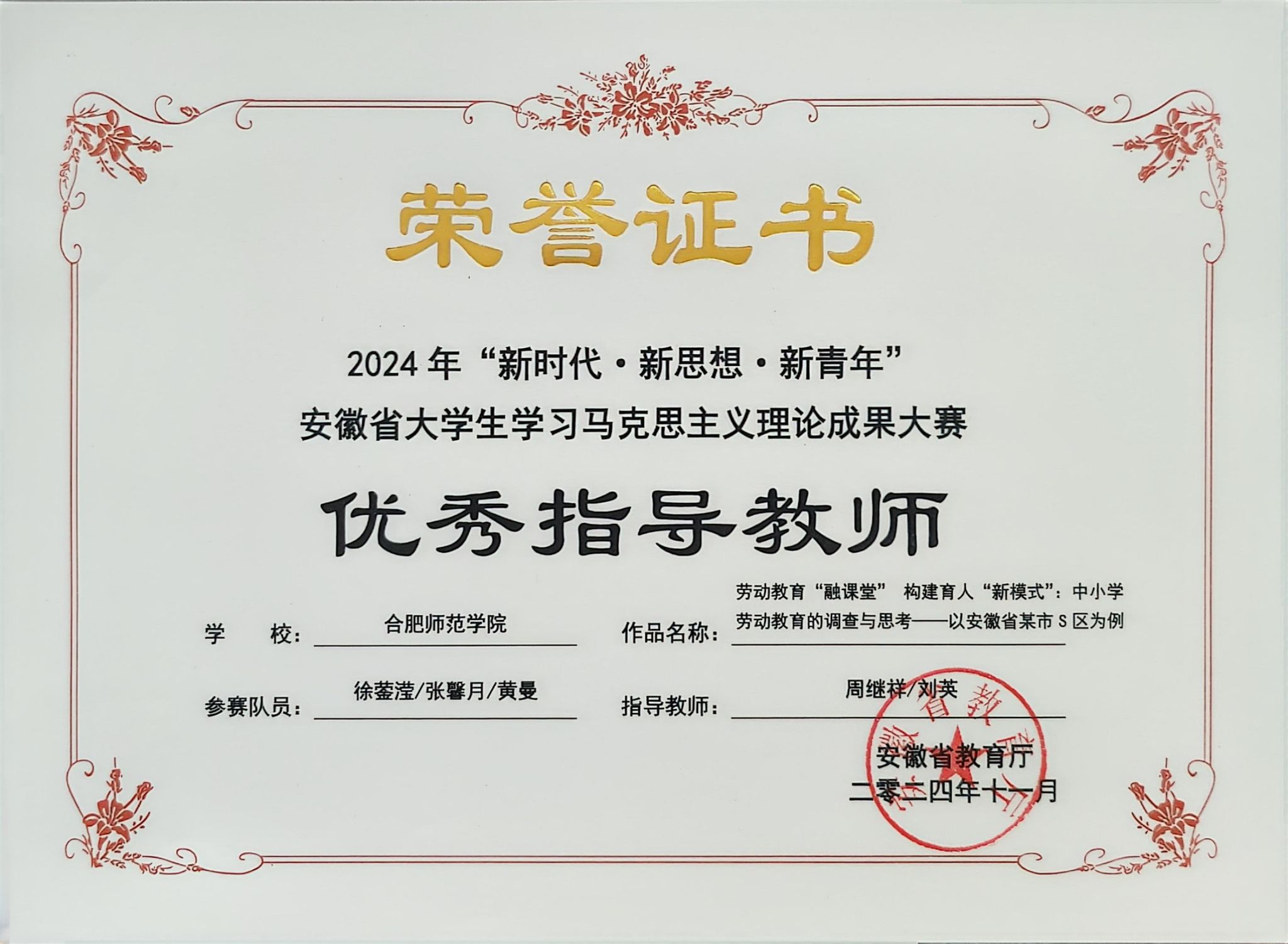 学校今年首次将此项比赛纳入思政综合实践课课程,全校大二学生全员参与,其他年级学生自愿参与,有4000多位学生参加比赛,较往年扩大了覆盖面,提升了影响力。经过班级初选、校级初赛、决赛三级选拔,实现了优中选优,提升报送作品的质量。最终,徐蓥莹、张馨月、黄曼同学的作品《劳动教育“融课堂”构建育人“新模式”:中小学劳动教育的调查与思考——以安徽省某市S区为例》(指导老师:周继祥、刘英)荣获调研报告一等奖,王文杰同学的作品《新时代大学生美育素养提升路径》(指导老师:朱玉利)荣获论文三等奖,王代源、卢佳杰、李梦瑶同学的作品《赓续红色精神,书写青春之路》(指导老师:魏兵、吴石英)荣获微视频三等奖。
