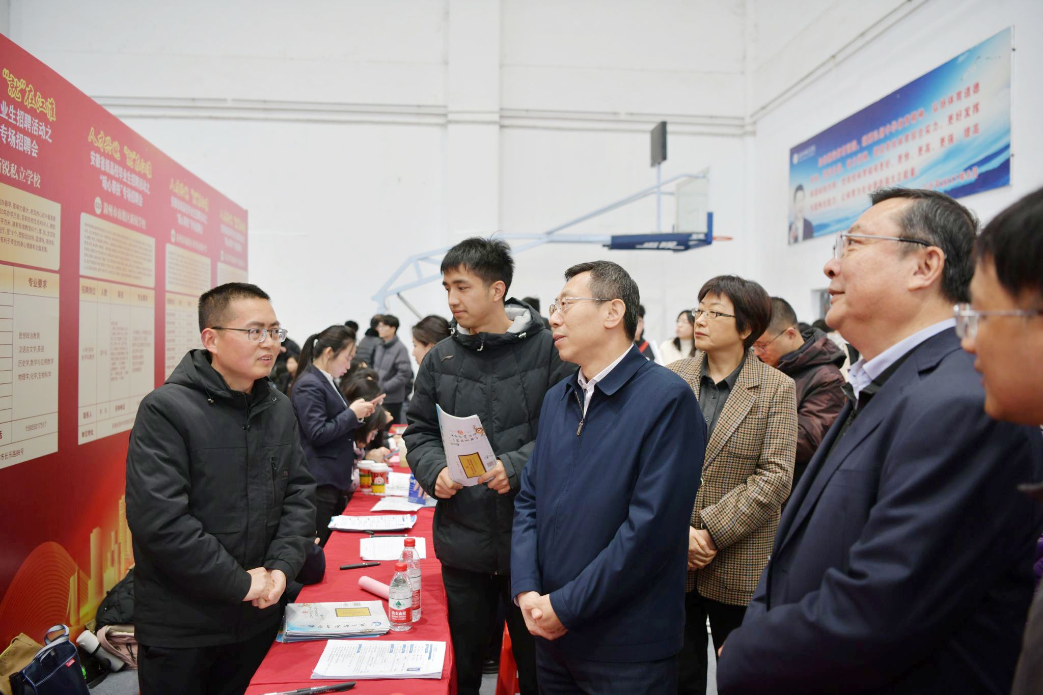 为深入学习贯彻习近平总书记关于做好高校毕业生就业工作的重要指示批示精神,落实省委、省政府人才兴皖的战略部署,为全省各类用人单位和高校毕业生搭建对接招聘平台,用心用情做好脱贫家庭、低保家庭、零就业家庭和残疾高校毕业生等重点群体就业工作,促进高校重点群体毕业生高质量充分就业,3月14日下午,由省教育厅、省人力资源和社会保障厅、国家开发银行安徽省分行联合举办,388vip太阳集团承办的“人才兴皖“就”在江淮”省级高校毕业生系列招聘活动之“暖心帮扶”专场招聘会在锦绣校区体育馆举行。安徽省委教育工委副书记范奇、国家开发银行安徽省分行党委委员、副行长钟鸣、安徽省教育厅高校学生处、大中专毕业生就业指导中心、学生资助管理中心、安徽省人力资源和社会保障厅就业促进和失业保险处相关负责同志,在院党委书记徐成钢,党委副书记、院长方东玲的陪同下来到招聘会现场。