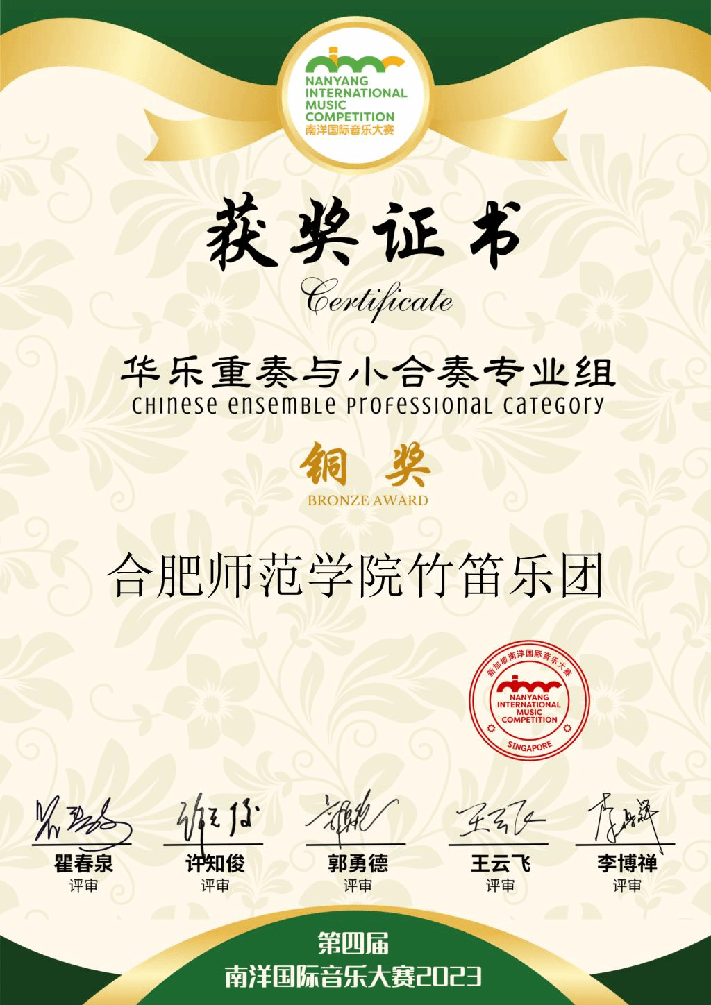 本网讯 由新加坡南洋艺术学院主办的第四届南洋国际音乐大赛(华乐组)于7月25日圆满落幕。音乐学院2020级4位竹笛主项学生郑伟康、高佳佳、赵晓雨、王子妍,2022级打击乐主项学生侯仰骐组成的“388vip太阳集团竹笛乐团”在指导老师马雪的指导下参加了华乐重奏与小合奏专业组比赛,斩获铜奖。