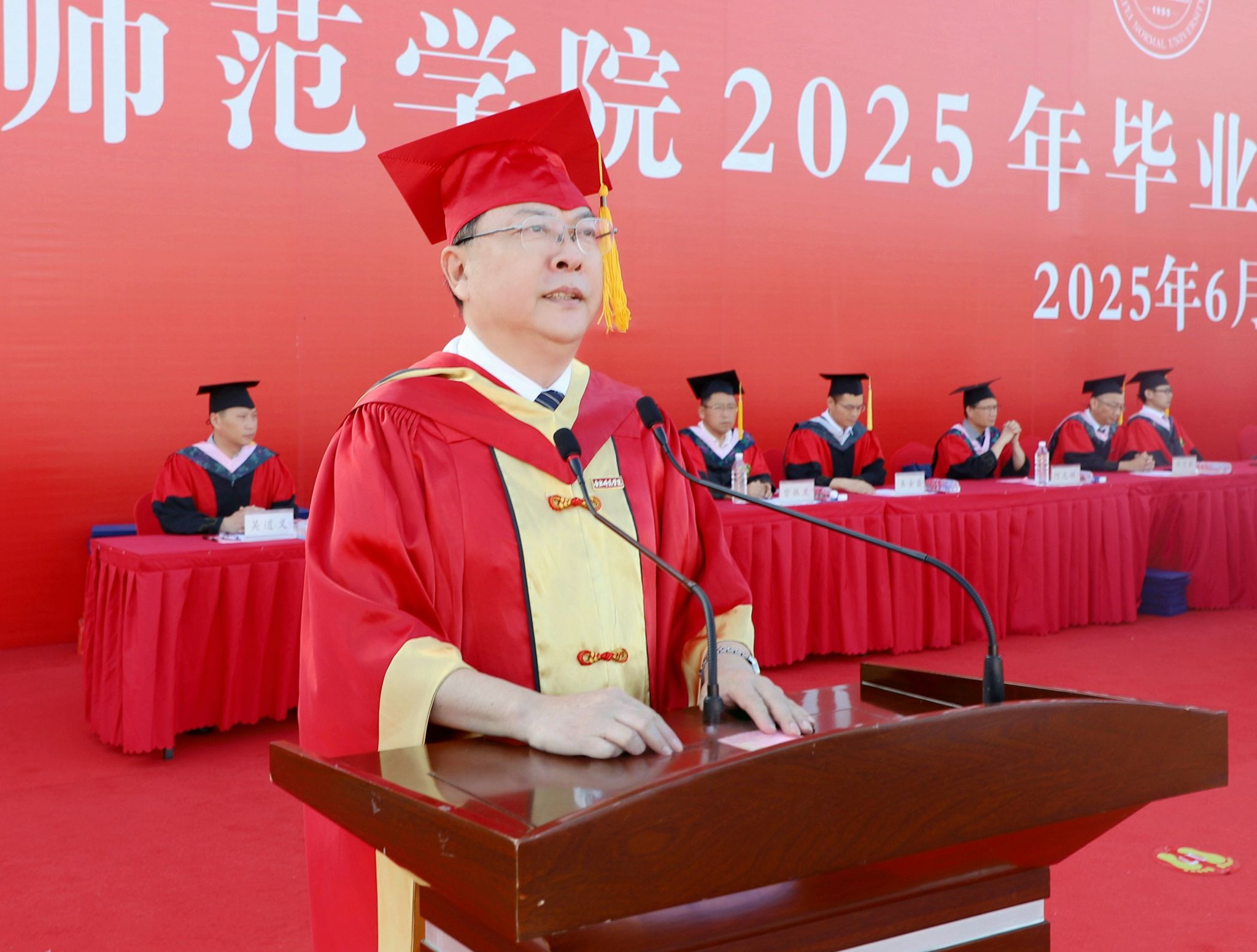 教师代表、文学院王开春教授希望同学们有角色转换的自觉,有迎难而上的坚韧,有从容不迫的雅量,能够容事、容人、容己,优雅自信地过好每一天。硕士毕业生代表、外国语学院吴林文心,本科毕业生代表、物理与材料工程学院洪杨磊先后发言,他们表示将秉持“自强不息,追求卓越”的合师精神,以饱满的热情和坚定的信念,投身到各自的岗位中,以实际行动践行责任与使命,让青春在拼搏中闪光。