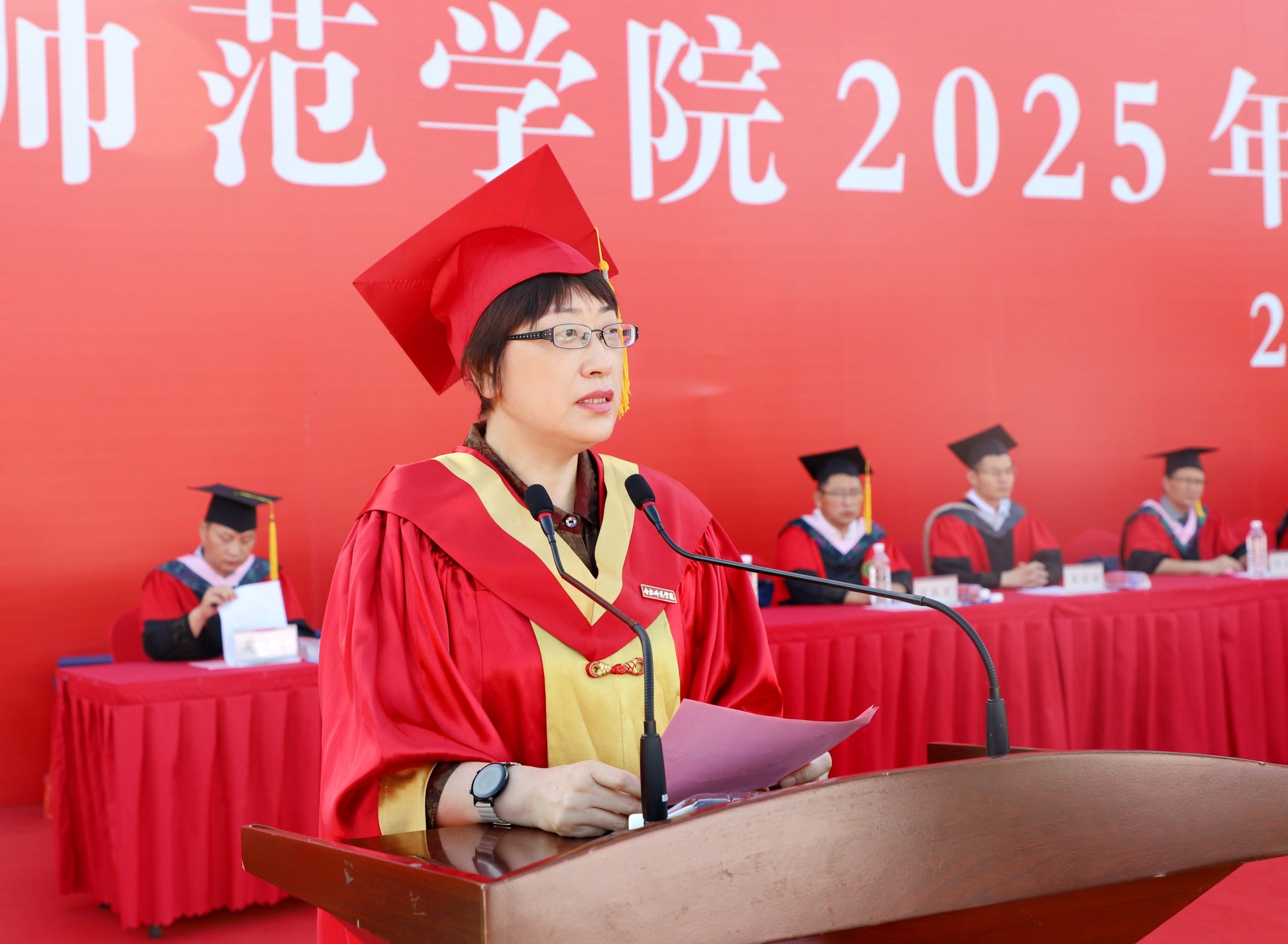 方东玲致辞,她代表学院向毕业生们送上热烈的祝贺和美好的祝愿,向倾情陪伴同学们成长的父母、悉心教导同学们成才的老师,致以崇高的敬意和衷心的感谢。她回顾了同学们在校期间学院的发展成就,赞扬了同学们所取得的优异成绩,指出,同学们与母校携手并进、攻坚克难,为即将迎来70周年校庆的合师增添了亮丽的青春底色。