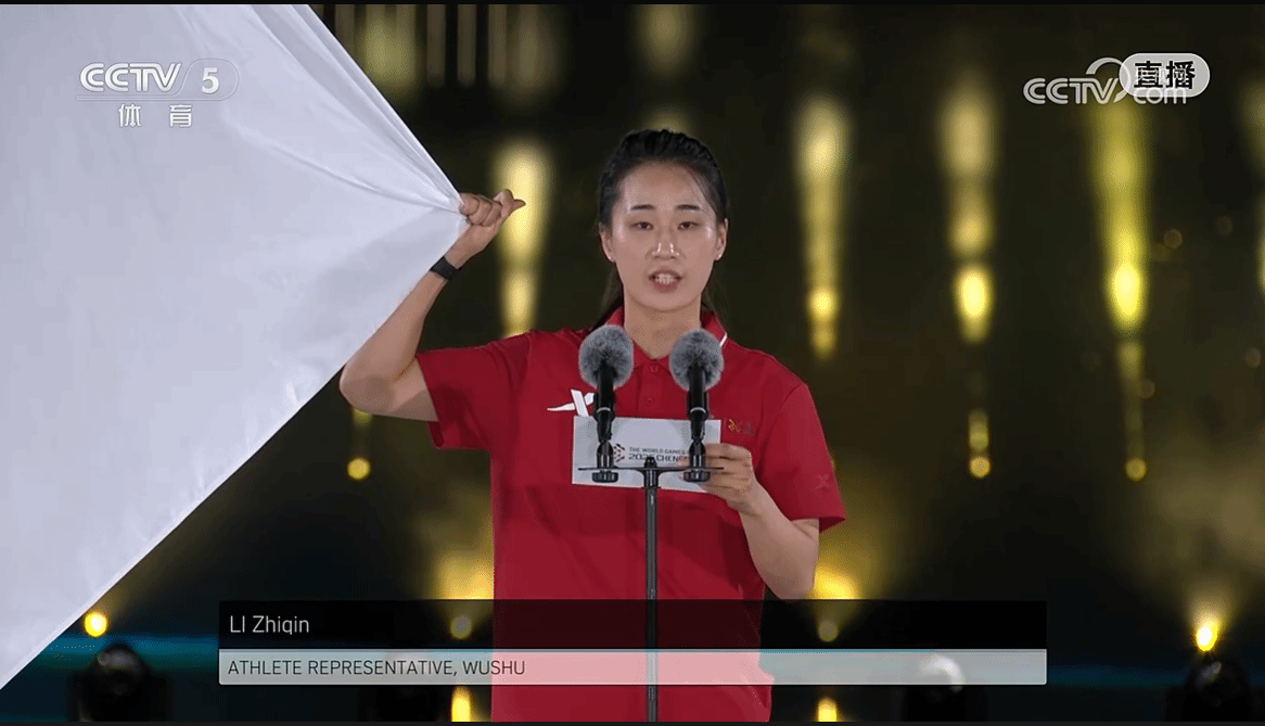 开幕式上,伴随着激昂的乐曲,身着中国国家队队服的李志勤老师步履坚定地走向宣誓台。聚光灯下,她神情庄重,手牵大会旗帜,庄严宣告,其沉稳自信的风度与铿锵有力的誓言,完美诠释了公平竞争、追求卓越的体育精神核心,赢得了现场国际嘉宾及全球观众的热烈掌声与赞誉。