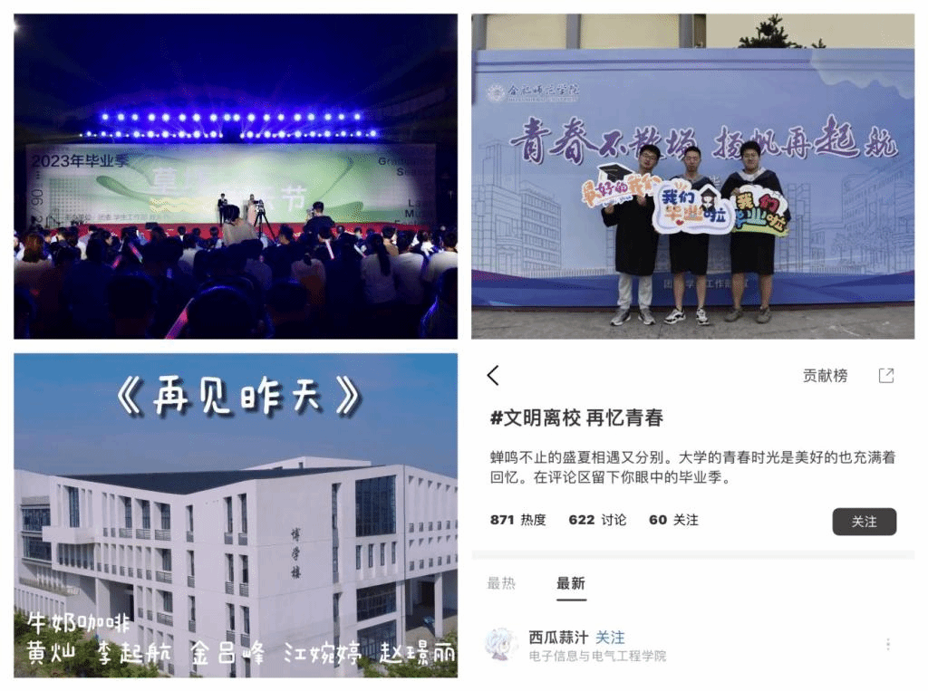 学院举办“季忆留夏·时光有你”2023年毕业季草坪音乐节,展示了他们从懵懂少年到成熟蜕变的成长历程。院团委、学生工作部在校园内布置毕业季横幅,在图书馆前广场、生活广场摆放毕业季桁架,让同学们在“青春不散场、扬帆再起航”标语下拍照打卡留念。院团委策划推出“2023毕业季”新媒体专题栏目,图文结合为毕业生们送上美好祝愿;摄制毕业季主题MV《再见昨天》,收获师生好评。学生工作部通过优课·今日校园平台发布“文明离校 再忆青春”话题,组织毕业生留下对母校的美好祝愿,800余人参与讨论。院学生会开展“我的旧物不毕业”跳蚤市场活动,让毕业生们在跳蚤市场上摆出了衣物、书籍等各式各样的二手物品。一系列活动营造了和谐温馨的毕业氛围,丰富了毕业生离校前的美好难忘时光。