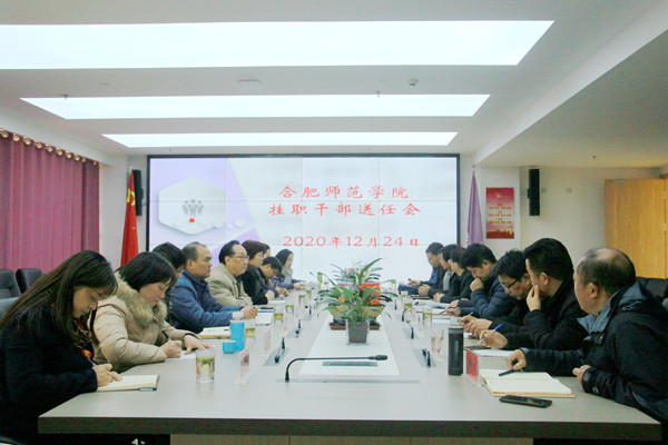 本网讯 12月24日下午,我院挂职合肥经开区教师送任会在合肥经开实验学校会议室举行,党委委员、副院长姚本先,教务处、组织部、人事处等单位负责人,挂职教师;合经区社会发展局党委副书记、纪委书记时宗田,党委委员、副局长杨会谦,党委委员、综合管理处处长刘艳松以及挂职学校领导参加会议。会议由杨会谦主持。