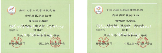 全国大学生数学建模竞赛是由教育部高等教育司、中国工业与应用数学学会共同主办的面向全国大学生的课外科技训练活动,是全国高校学科竞赛排行榜列入赛事,安徽省A类大学生学科竞赛,赛事创办于1992年,每年一届,目前已成为全国高校规模最大的基础性学科竞赛,也是世界上规模最大的数学建模竞赛。大赛的目的在于激励学生学习数学的积极性,提高学生建立数学模型和运用计算机技术解决实际问题的综合能力,鼓励广大学生踊跃参加课外科技活动、开拓知识面、培养创造精神及合作意识,推动大学数学教学体系、教学内容和方法的改革。2020年全国大学生数学建模竞赛共有来自全国及美国、英国、马来西亚的1470所院校、45680个队、超过13万名大学生报名参赛。全国一等奖获奖比例为0.7%、二等奖为2.87%。
