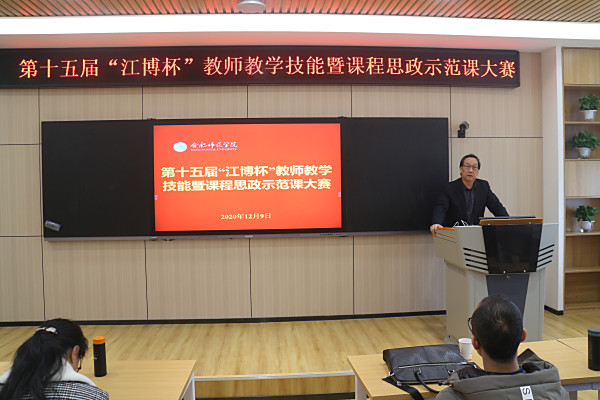 本网讯 为进一步推进“课程思政”教学改革,构建全员全方位全过程育人的良好格局,12月9日下午,由教务处和校友会联合主办的第十五届“江博杯”教师教学技能大赛暨“课程思政”示范课大赛决赛在锦绣校区逸夫楼举行,党委委员、副院长姚本先出席活动并讲话。