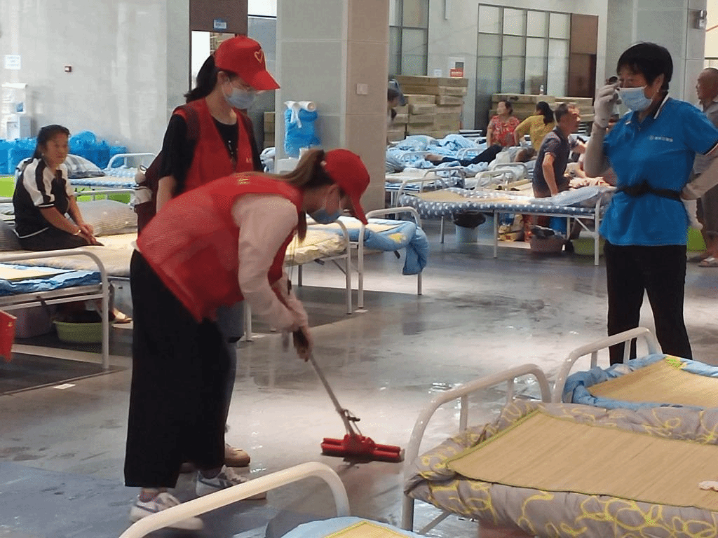 7月26日,这是2019级外国语学院的解文涵和艺术传媒学院的朱学萌记忆中整个假期里最有意义的一天。原本负责D区服务工作的她们早上刚到安置点就发现保洁阿姨忙碌异常,一问才知道,D区的水箱漏水严重导致整个走廊满是积水。保洁阿姨满头大汗、手慌脚忙的身影始终在两人眼前挥之不散。投入志愿岗位后她们心照不宣地加快了工作速度,甫一结束便赶去帮助保洁阿姨。“阿姨,这里的地我们来拖吧,您先去旁边喝点水坐一会儿吧。”说着便拿起了拖把和水桶开始埋头苦干。她们一人拿着干拖把拖地,一人在旁边提着水桶,弯着腰前行,晶莹的汗珠顺着两鬓淌下,衣衫鞋袜早已被汗水湿透。
