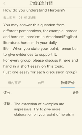 张老师也会通过分组任务,将同学们从“云端”有机结合起来,共同就发放的某一个与文本相关的话题进行小组讨论,让学习从个人拓宽到了集体。老师也会对每组进行评分和有机评价,这有利于激发我们的求知欲望和学习兴趣。