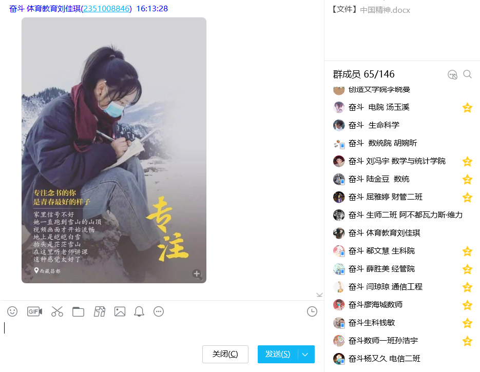 最后,许老师进行了直播总结:在我们国家和民族的历史传承之中,青年是我们在历史传承之中每一个时代的接棒人,一代人有一代人的长征,一代人有一代人的担当。经过这次战“疫”,我们应当缅怀那些牺牲在前线的医务工作者,应当学习共产党员在民族灾难前的前赴后继,应当高举中国精神的展现者、发扬者的旗帜,应当相信中国智慧、中国精神、中国力量赋予我们的自信与自强。