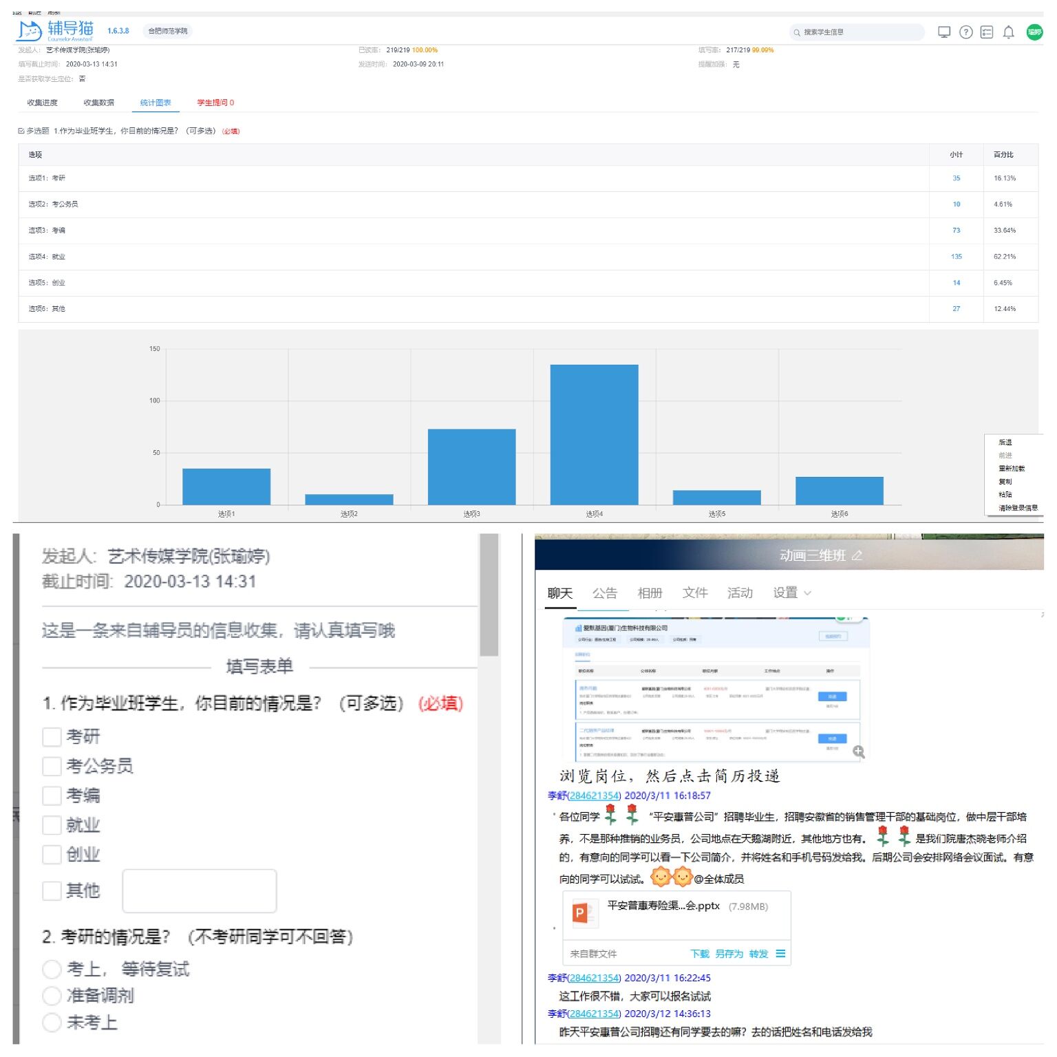 拓渠道稳就业,提供专门服务。抓紧抓实工作创新,全力以赴拓展就业渠道,精准提供就业服务,确保就业安全,打好稳就业“组合拳”。疫情发生以来,积极打造就业指导“云平台”,开启就业“云咨询”,利用线上班会、组织生活“线上过”、“云家访”,利用学院青年公众号和“辅导猫”,建立“就业工作群”“毕业生微信联络”平台,发布疫情期间的“就业政策”“就业工作安排”“线上招聘信息”,目前已提供就业岗位信息67条,为毕业生适时送上就业信息,保证了不因疫情影响就业推进。组织学生线上聆听安徽省启明星就业指导专家、学校客座教授、安徽省人力资源经理人协会会长匡龙云老师专题讲座,提升学生对职业的理解、对就业概念的掌握和对未来职场的认知。加强网上就业指导,指导毕业生就业“走网路”“不跑路”,组织毕业生参加“24365校园招聘”“合肥市2020年春季网络联合招聘”和学校网上招聘会,指导识辩“云招聘”信息,鼓励线上签约。加强特殊群体精准帮扶,全面掌握建档立卡、家庭经济困难和身体残疾毕业生就业意向情况,启动和实施分类帮扶和“一生一策”动态管理,有针对性提供就业帮扶,保证就业困难毕业生合理期望下的充分就业。