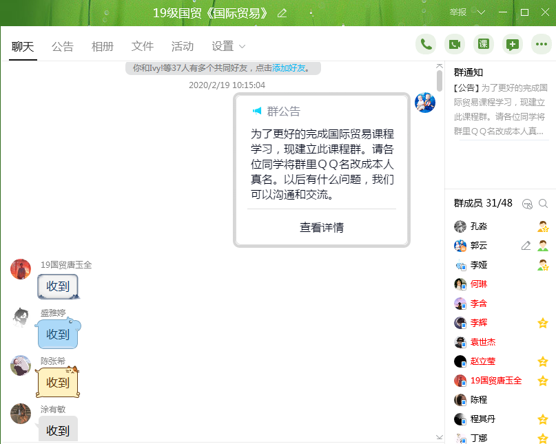 为适应线上教学的要求,我在课前做了大量的准备工作,精心设计课程内容,并克服了诸多问题,如“超星学习通”平台操作不熟悉、原有教学设计不适合线上教学特点、课程线上资料不丰富等。为此,在开课前我认真学习了“超星学习通”平台操作技巧,并提前和学生沟通测试平台效果,以确保课程的顺利进行。同时,根据《国际贸易》课程每部分不同教学内容的特点,进一步细化了在线教学任务内容,并通过提供相关阅读教材、期刊、网络短视频资料等内容来丰富学生知识的广度和深度。考虑到《国际贸易》课程是在每周一上午开课,网络可能拥堵,故提前录制了相关教学视频。同时,为了加强交流,设立了QQ课程群,以确保线上教学整体效果。