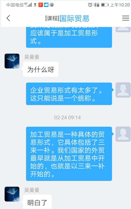 《国际贸易》课程的线上教学,是采用“直播+录播+MOOC慕课+学生自学”混合式教学模式来进行的,并采用了多元化手段来助力线上教学效果。学生每次开课前,我会将此次课程内容提前放在平台以便学生“预习”。开课时,会以平台“通知”的方式告知学生此堂课的学习任务,以便学生明确学习目标。同时,通过“学习通”签到打卡,以掌握学生的到课情况。开课中,会以直播点名提问、录播教学视频中随机设立讨论题要求学生在讨论区回答及小节测试等手段,来掌控学生的学习状态。课后,会以要求学生定期完成平台作业的形式,来及时了解学生知识掌握的薄弱点,以便下节课有针对性的加强学习。