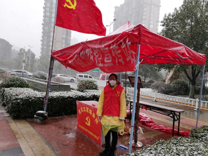 微雨天气,2019级制药工程(中爱合作)班的方舒淇立在小区门前的疫情防疫宣传站,耐心为过往居民宣传疫情防控工作。在骤降的气温下,她的坚持义无反顾。