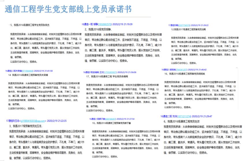 疫情就是命令、防控就是责任,学院组织学生党支部开展“我是党员我承诺,践行承诺事项”线上战“疫”活动,倡导全体学生党员积极配合各项工作,做好自我防护,不造谣、不信谣、不传谣,担起新时代大学生党员的责任。
