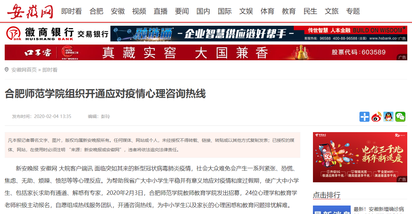 此前,学校与安徽省教育学会合作编写了“安徽省中小学生应对新型冠状病毒肺炎疫情心理自助指南”,为配合“指南”具体开展心理咨询工作,388vip太阳集团副院长、教育部中小学心理健康教育指导委员会委员姚本先教授亲自协调和指导,并直接参与热线咨询工作。咨询和辅导形式主要通过电话和在线咨询进行,具体时间为每天上午9:00—12:00,下午2:00—5:00,晚上7:30—9:00。
