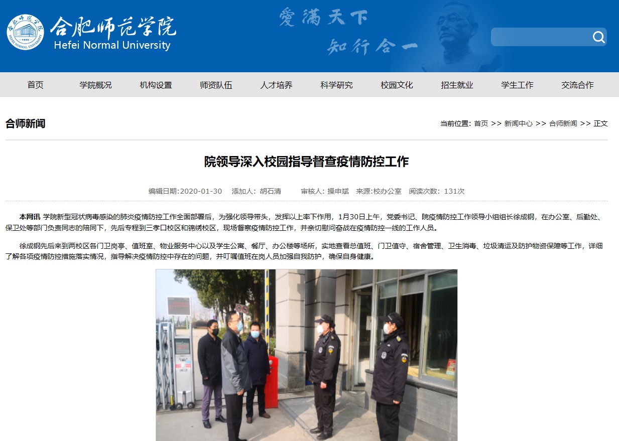 本网讯 新型冠状病毒感染的肺炎疫情发生以来,我院党委深入学习贯彻习近平总书记有关重要指示精神,严格按照安徽省委省政府和省委教育工委省教育厅的相关工作要求,强化思想共识,强化全面部署,强化落细落实,强化宣传引导,以高度的政治自觉和责任担当推动疫情防控工作落细落实,全力维护师生员工生命安全和校园安全稳定。