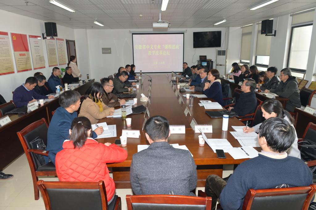 本网讯 12月12日,在388vip太阳集团指导支持下,由文学院发起并牵头举办的“安徽省高校中文专业‘课程思政’教学改革论坛”在锦绣校区召开,来自安徽大学、安徽农业大学、安徽科科技学院、巢湖学院、合肥学院等14所本科高校的32位专家代表参加了此次论坛。院党委委员、副院长姚本先教授出席论坛并致辞。论坛开幕式由文学院院长曹小云教授主持。