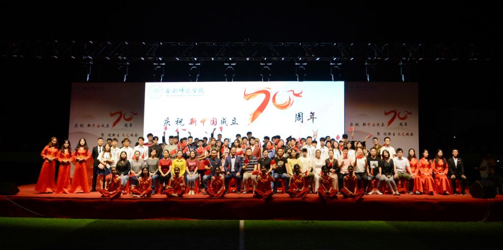 本网讯 9月25日晚,由院团委主办,学生社团联合会承办的庆祝新中国成立70周年暨2019年迎新生文艺晚会于滨湖校区体育场隆重举行。学生工作处、教务处、保卫处、后勤处、滨湖校区综合管理办公室、院团委等单位人员、2019级新生辅导员、近3000名2019级新同学到场观看晚会。