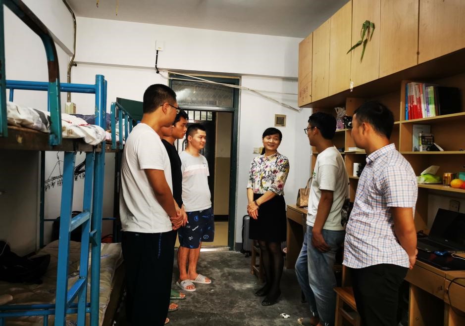 下午,数统学院党委书记郑支农一行前往新生宿舍,慰问了刚刚入住宿舍的新生们。她亲切地询问了同学们对新环境是否适应,询问同学们的需求,提醒新生注意疫情防控、注意防盗防骗,并向新生讲解了如何解决宿舍中一些常见的问题。