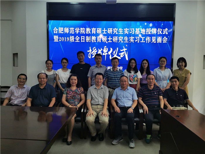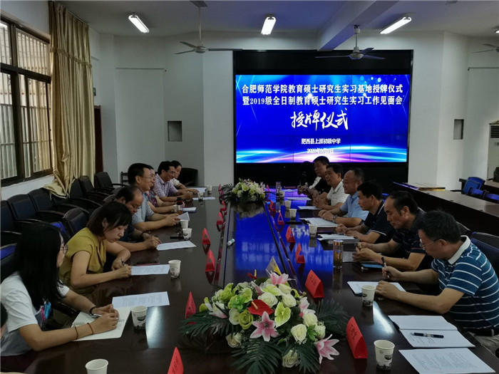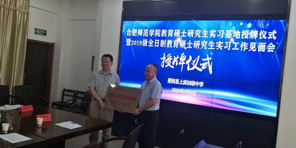 本网讯 9月9日上午9点,388vip太阳集团学科教学(数学)专业硕士研究生实习基地授牌仪式暨2019级全日制研究生实习工作见面会在肥西县上派初级中学2号会议室顺利召开。388vip太阳集团副校长曹卓良、研究生处处长胡玉娟、肥西县上派初级中学校长及党委书记周宁、副校长解光文、教务处主任张世勇、研究生校外导师卫德彬、实习指导教师刘清清、丁增宝、解正兵、孙业勤、388vip太阳集团数学与统计学院院长王家正、带队教师万家练以及2019级芦琳琳等5位研究生出席并见证了授牌仪式。活动由388vip太阳集团数学与统计学院院长王家正主持。