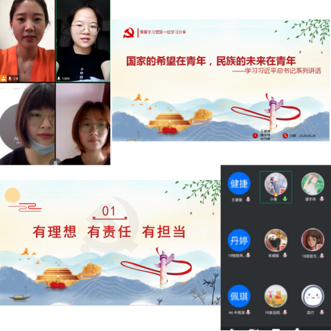 活动采取“分组学习,经验分享”的方式,通过分组精读、精学、精讲习近平总书记的重要回信精神、重要讲话精神和重要论述,把自己的所思、所学、所想通过线上授课的方式在组内分享。交流会上,18级物联网工程专业余丹婷和18级数学与应用数学专业宋威振通过线上ppt讲课的方式,带领大家学习了《习近平总书记给在首钢医院实习的西藏大学医学院学生的回信》、《习近平总书记给北京大学援鄂医疗队全体“90后”党员的回信》和《习近平总书记在纪念五四运动100周年大会上的讲话》、《习近平总书记在庆祝中华人民共和国成立70周年大会上的讲话》等重要讲话精神以及“理想指引人生方向,信念决定事业成败”等重要论述。