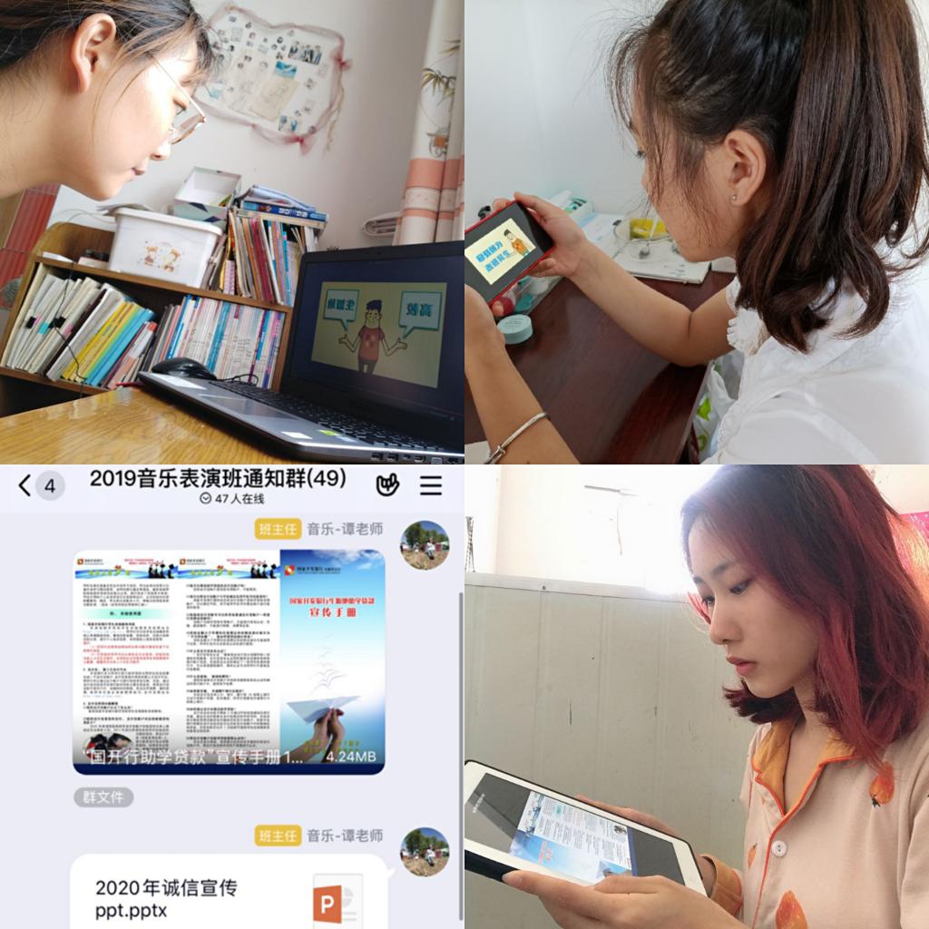 音乐学院各年级、各班开展线上主题班会传递资助政策与诚信教育,在主题班会中,一是加强资助宣传,引导学生在申请国家助学贷款、国家助学金等国家音乐学院开展资助项目时,恪守诚信,如实承诺,真实填报申请材料。共同观看助学贷款宣传片,学习宣传手册与ppt,班主任进行讲解与案例分析;二是开展诚信教育,针对即将到来的网络期末考试,进行“云上”诚信考试承诺书的签订。进一步培养学生诚实守信、遵纪守法的优良品格和作风。