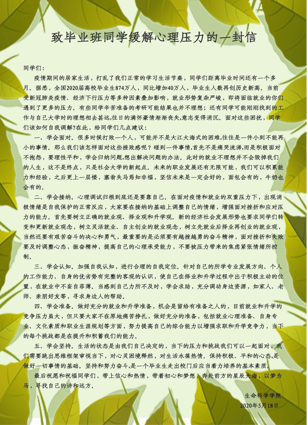 时至各大高校研究生复试时间,不少同学在准备复试的过程中倍感压力,同时还有部分同学由于今年疫情的原因,在求职中遇到了一些困难,针对以上同学可能出现的心理困扰,生命科学学院党委着手起草了《致毕业班同学缓解心理压力的一封信》,针对目前毕业班学生可能会面临的一些困扰,一一给出了心理调试的建议,通过发送到班级QQ群和学院微信公众号推送给每一位毕业生。