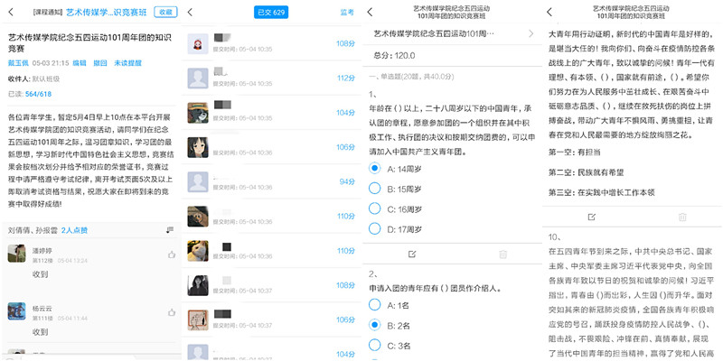 5月4日上午10点,艺术传媒学院通过“学习通”在线平台开展了“纪念五四运动101周年团的知识竞赛”,竞赛以团的基础知识、特殊时期的抗疫知识、习近平总书记的重要讲话为内容,共计120分。经统计,本次全院共有629名青年学生参与了竞赛,其中472人最终成绩超过100分。团的知识竞赛带领学院青年学生重温了习近平总书记在纪念五四运动100周年上的重要讲话,引导团员深入学习党团知识,营造了全院良好的学习氛围。