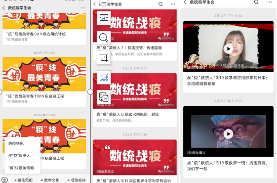 在学院层面,积极利用官方微信公众号、官方QQ等平台对学院的防疫工作进行宣传报道。通过开设《战“疫”数统人》栏目发布学生原创微视频、征文、书法、绘画等作品,为武汉加油、为中国加油;通过开设《“疫”线最美青春》栏目对学院30余名防疫志愿者的事迹进行了系列报道;通过树立典型、榜样示范对广大学生进行思想政治教育引领,同时学院学生会制作了《做战“疫”的主角》《战疫中最亮的星》等原创战疫宣传片,深受学生们的喜爱和好评。