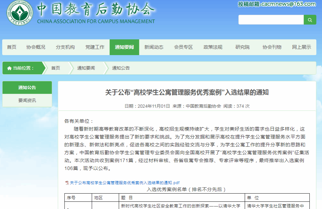 近日,中国教育后勤协会学生公寓管理专业委员会面向全国高校开展了“高校学生公寓管理服务优秀案例”征集活动,我院《388vip太阳集团学生公寓管理与服务的实践体会》工作案例成功入选。