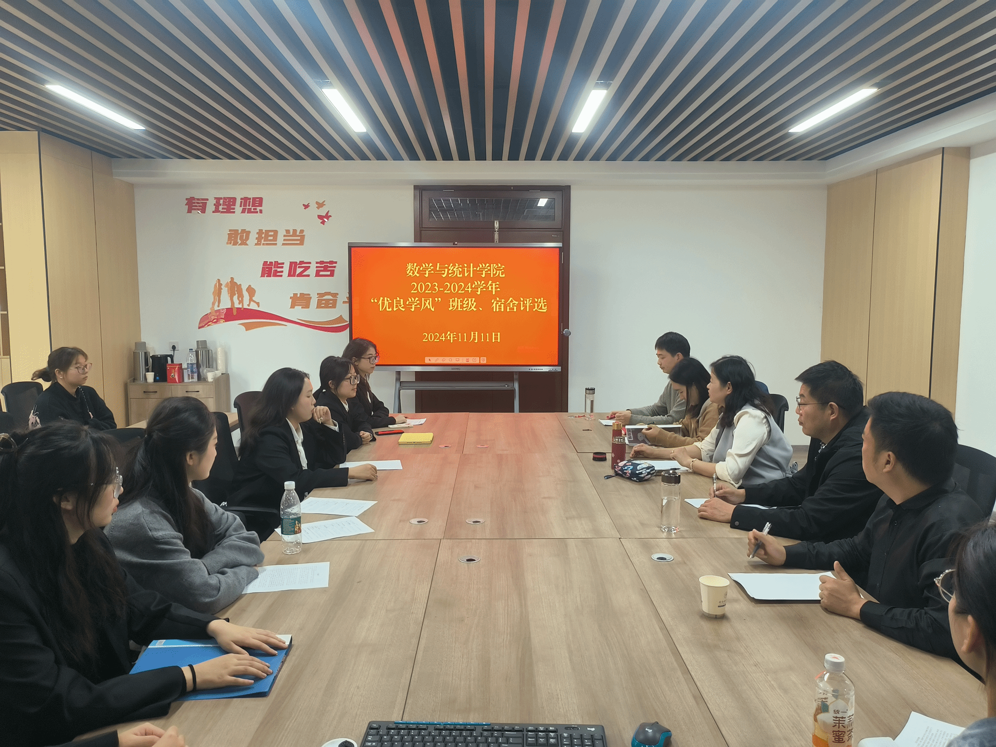 为表彰在学风建设中表现突出的集体和个人,进一步激发广大学生的学习积极性和创造力,营造更加浓厚的学习氛围和积极向上的校园文化,11月11日,数学与统计学院在滨湖校区E启航科创工作室举行2023-2024学年优良学风班级、宿舍、个人评选活动。学院党委书记穆娟、副书记陶金昌,辅导员周丽娜、王志、曾飞参加活动并担任评委。来自2022级和2023级的8个班级、13个宿舍、36名个人参与此次评选。