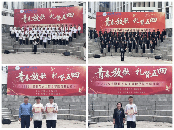 弦舞吉他社以一曲《太聪明》拉开序幕,清新旋律点燃现场热情;2024级计算机科学与技术二班用《光荣啊,中国共产党》与《夜空中最亮的星》诠释信仰与理想的交织;踏歌汉文化协会带来走秀《霓彩华裳》,传统服饰与现代舞台碰撞出文化自信的火花;人工智能班、软件工程班等团队通过《仰望星空》《紫荆花盛开》《少年中国说》等曲目,唱响青春誓言,抒发爱国深情;比赛尾声,2024级计算机科学与技术一班以铿锵有力的《少年中国说》将气氛推向高潮。舞台上,整齐的队列、创意的编排与学子眼中的光芒,展现了“00后”独有的创新与担当。活动期间,学生们自发发起“滨湖校区最强音”话题,将传统合唱与新媒体结合,赋予五四精神新时代的活力。其中,计算机科学与技术一班凭借《光荣啊,中国共青团》的磅礴气势与《少年中国说》的青春律动摘得桂冠;人工智能班和数据科学与大数据技术班以深情的爱国赞歌和励志旋律荣获二等奖;其余班级获三等奖。学院领导为获奖班级颁发荣誉证书并合影留念。