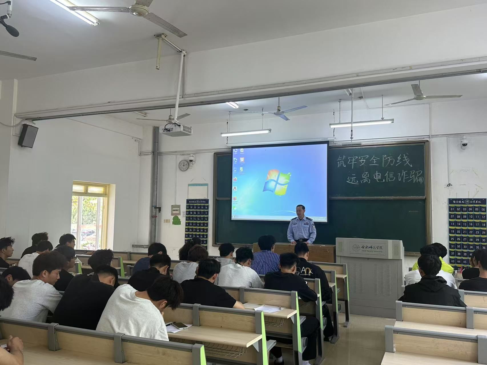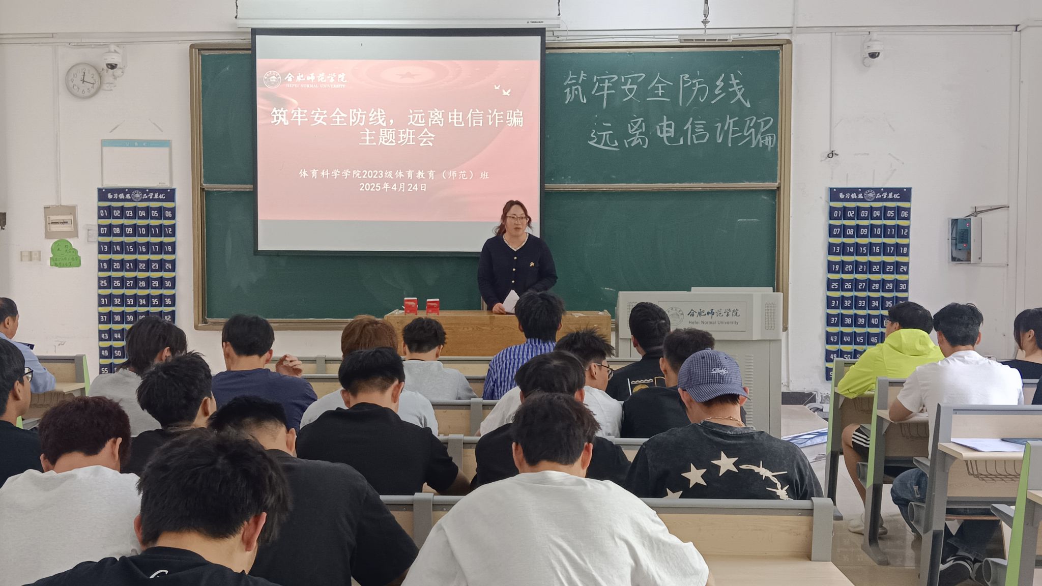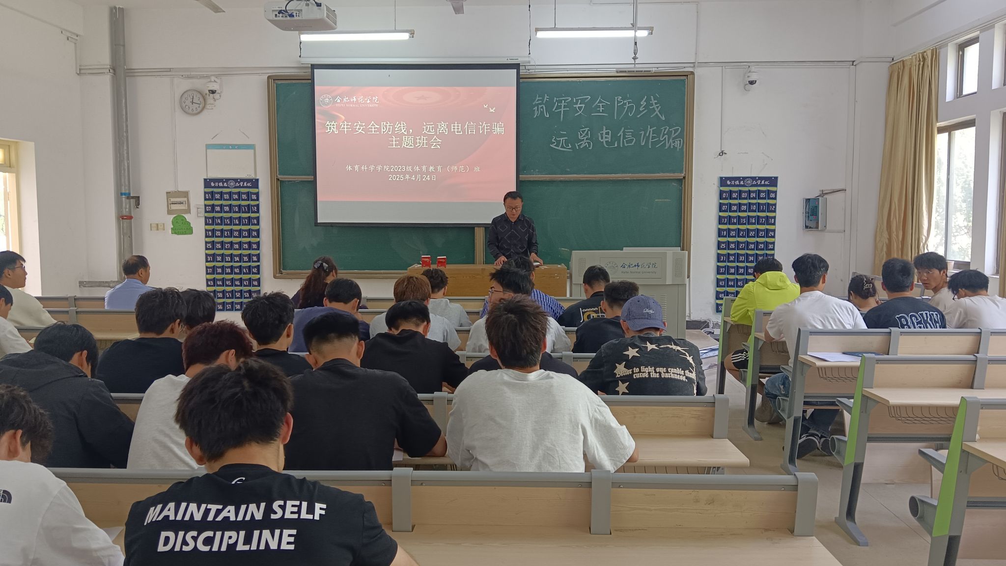 为增强学生防范电信诈骗意识,提升识骗防骗能力,4月25日中午,体育科学学院在博约楼109教室召开“筑牢安全防线,远离电信诈骗”主题班会,特邀锦绣派出所郭佳鹏警官到场宣讲,学院党委副书记马飞艳、2023级体育教育普招班全体学生参加。班会由辅导员钱昶臻主持。