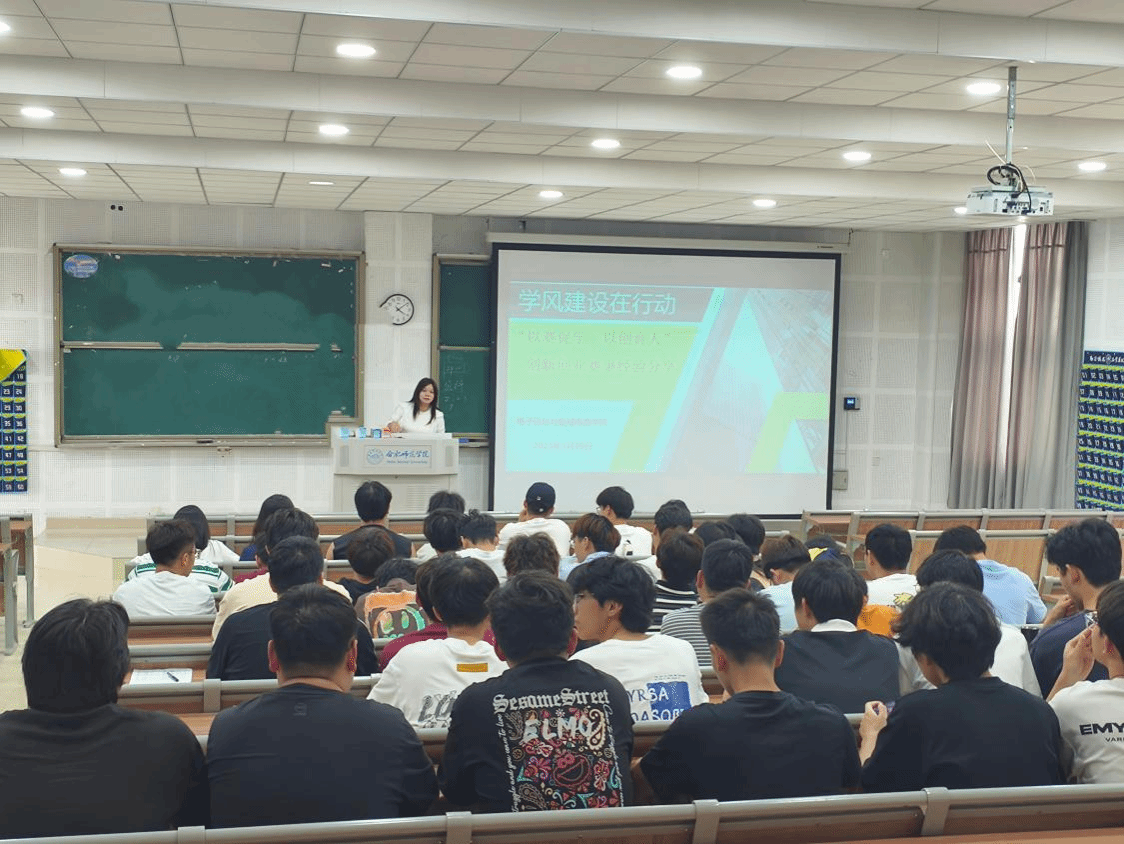 为加强学风建设,激发学生创新创业热情,引导低年级学生做好职业生涯规划,5月29日,电子信息与集成电路学院在滨湖校区博学楼D101举办“以赛促学 以创育人”学风建设专题讲座。本次讲座由全国首批教育部辅导员名师工作室——“匠心筑梦”创新创业工作室主持人、学院辅导员周玉老师主讲,学院2023、2024级200余名同学参加。