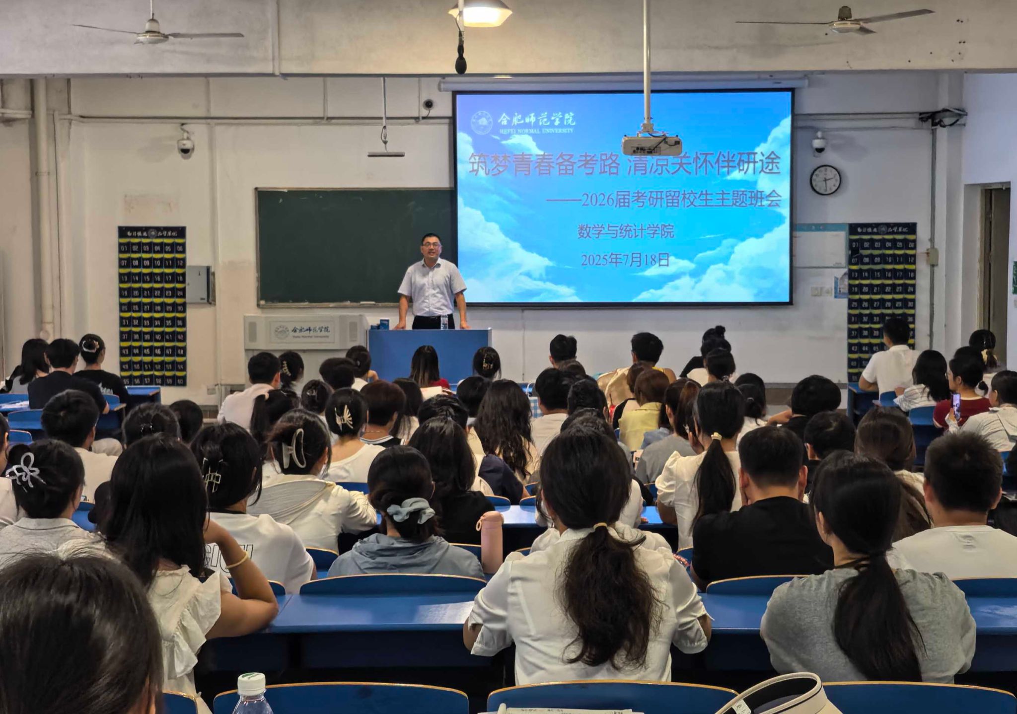 为深入了解留校学生学习生活情况,鼓舞学习斗志,7月18日下午,数学与统计学院在逸夫楼A109教室召开助力2026届考研主题班会,副院长周端明、就业创业处、数学与统计学院相关负责人参加并为同学们送去清凉慰问品。